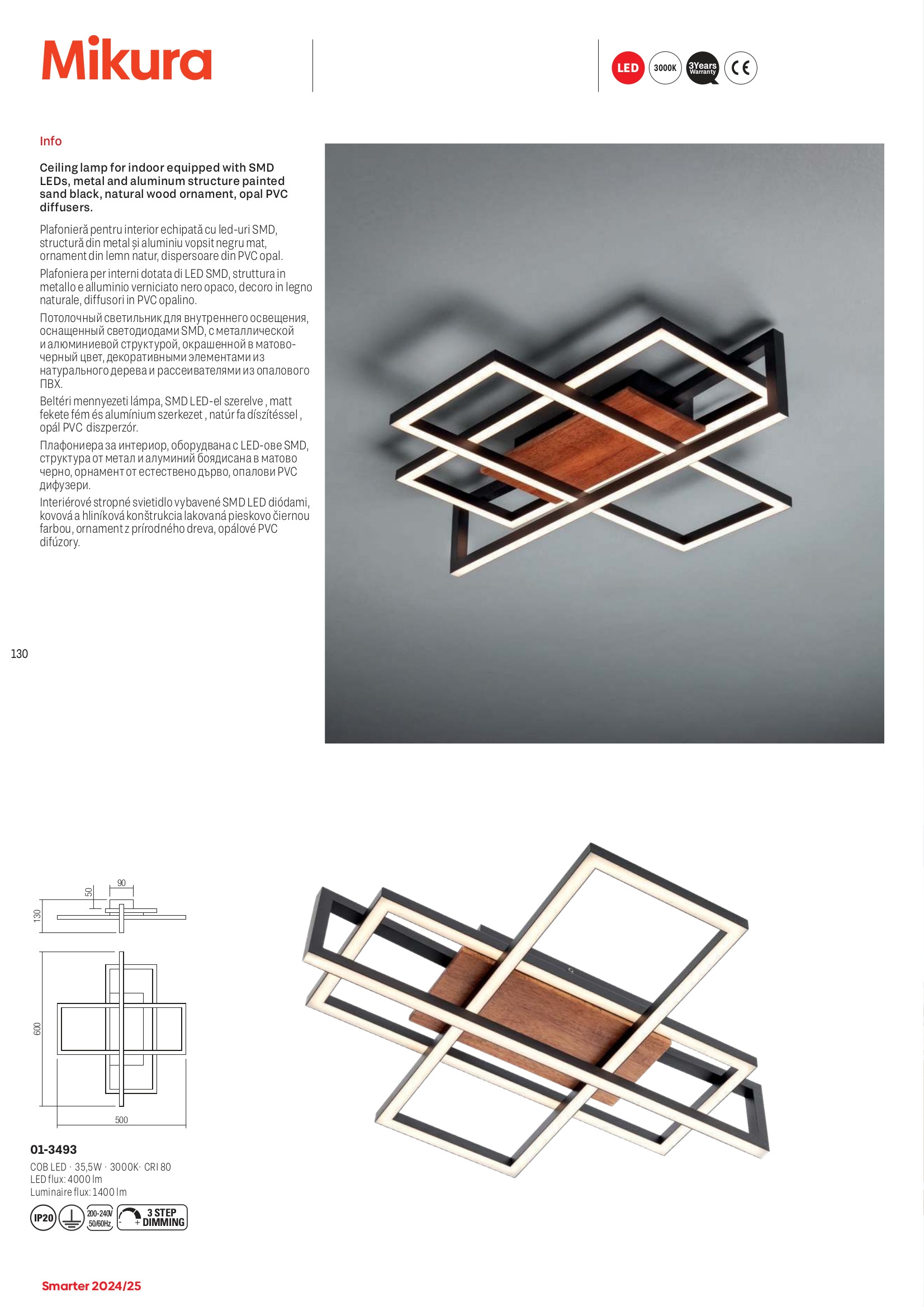 Осветителното тяло 01-3493 ще осигури комфорт и естетика във всяко помещение, в което се постави. Цялостната визия и дизайн на лампата и вложените в изработката й материали, като метал и алуминий в матово черно, орнамент от естествено дърво, опалово бели PVC дифузери, ще допринесат за един неповторим стил. Благодарение на дългогодишния опит, качествените материали и строгия контрол на качеството на изработка на дизайнерската линия Redo Smarter на производителя Redo (Румъния), 01-3493 е на високо европейско ниво.