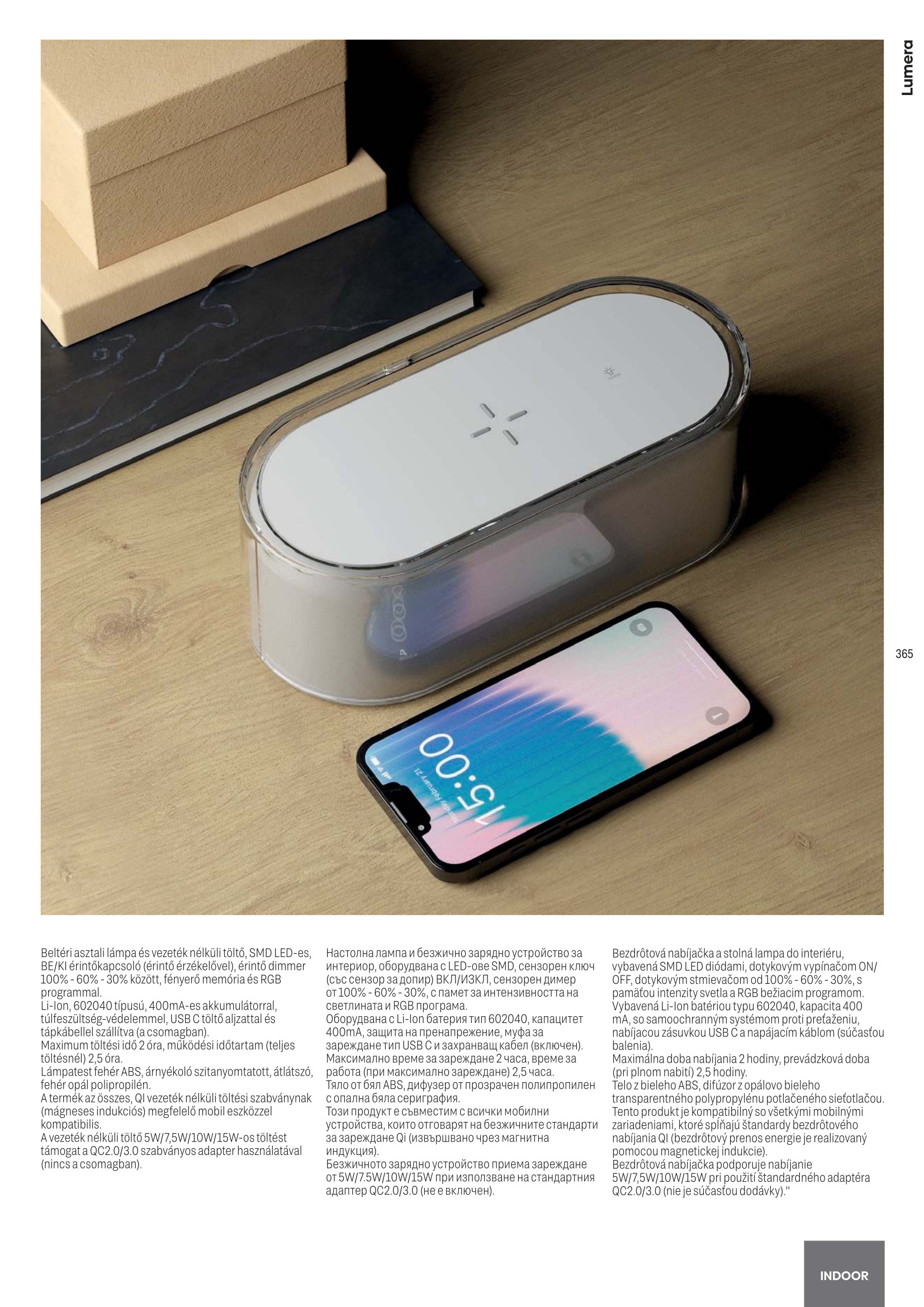 бял полимер (ABS), дифузер от прозрачен полипропилен с опалово бяла сериграфия, RGB, безжично зарядно за всички видове смартфони за безжично зареждане, USB порт, сензорен ключ, захранващ кабел, стандартен адаптер QC2.0/3.0 (не е включен)
