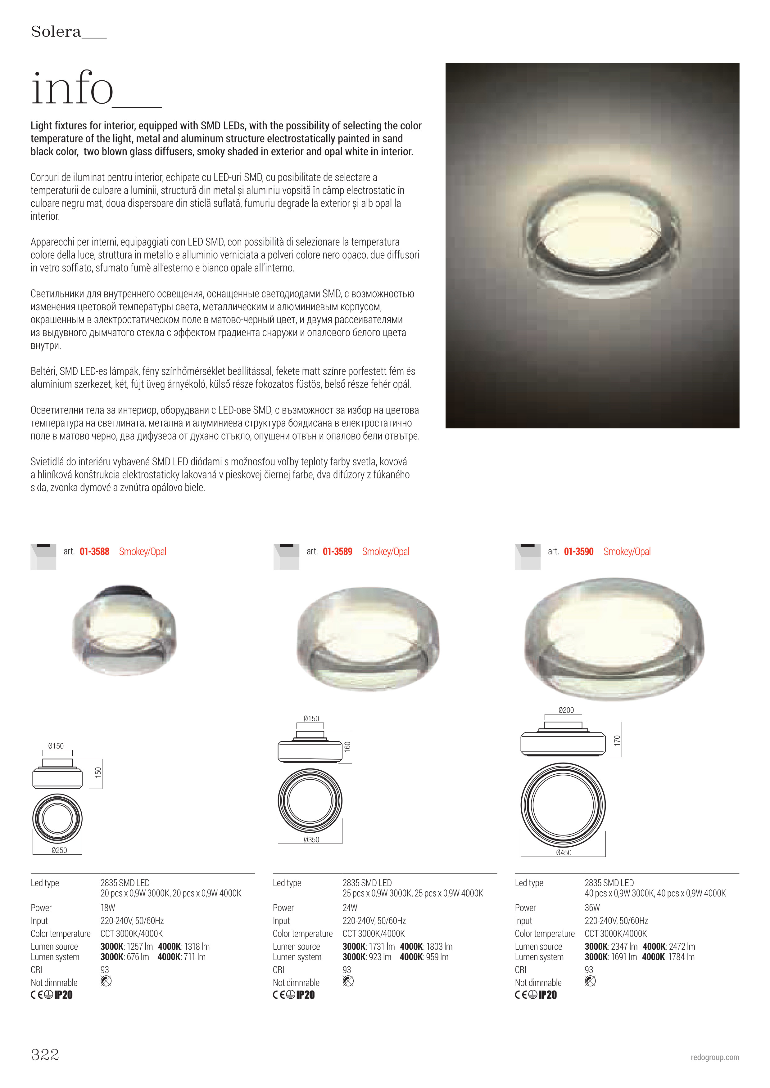 Осветителното тяло 01-3588 ще осигури комфорт и естетика във всяко помещение, в което се постави. Цялостната визия и дизайн на лампата и вложените в изработката й материали, като алуминий в матово черно, два дифузера, външен от опушено прозрачно стъкло и вътрешен в опалово бял цвят, избор на цветна температура ССТ 3000K/4000K, ще допринесат за един неповторим стил. Благодарение на дългогодишния опит, качествените материали и строгия контрол на качеството на изработка на дизайнерската линия Redo Indoor на производителя Redo (Румъния), 01-3588 е на високо европейско ниво.