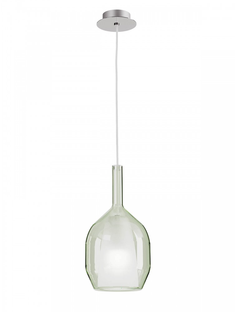 хромирана метална кострукция, дифузер от издухано боросиликатно прозрачно светло зелено стъкло, вътрешната част на дифузера е от сатенирано бяло стъкло, прозрачен кабел с дължина 2.5m