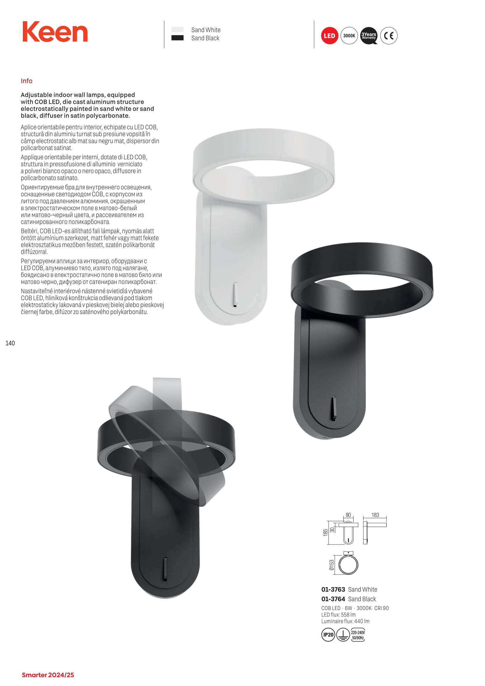 Осветителното тяло 01-3764 ще осигури комфорт и естетика във всяко помещение, в което се постави. Цялостната визия и дизайн на лампата и вложените в изработката й материали, като алуминиево тяло, излято под налягане с регулируем източник на светлина, с нанесен в електростатично поле, матово бял цвят, дифузер от сатениран поликарбонат, ключ ON/OFF, ще допринесат за един неповторим стил. Благодарение на дългогодишния опит, качествените материали и строгия контрол на качеството на изработка на дизайнерската линия Redo Smarter на производителя Redo (Румъния), 01-3764 е на високо европейско ниво.