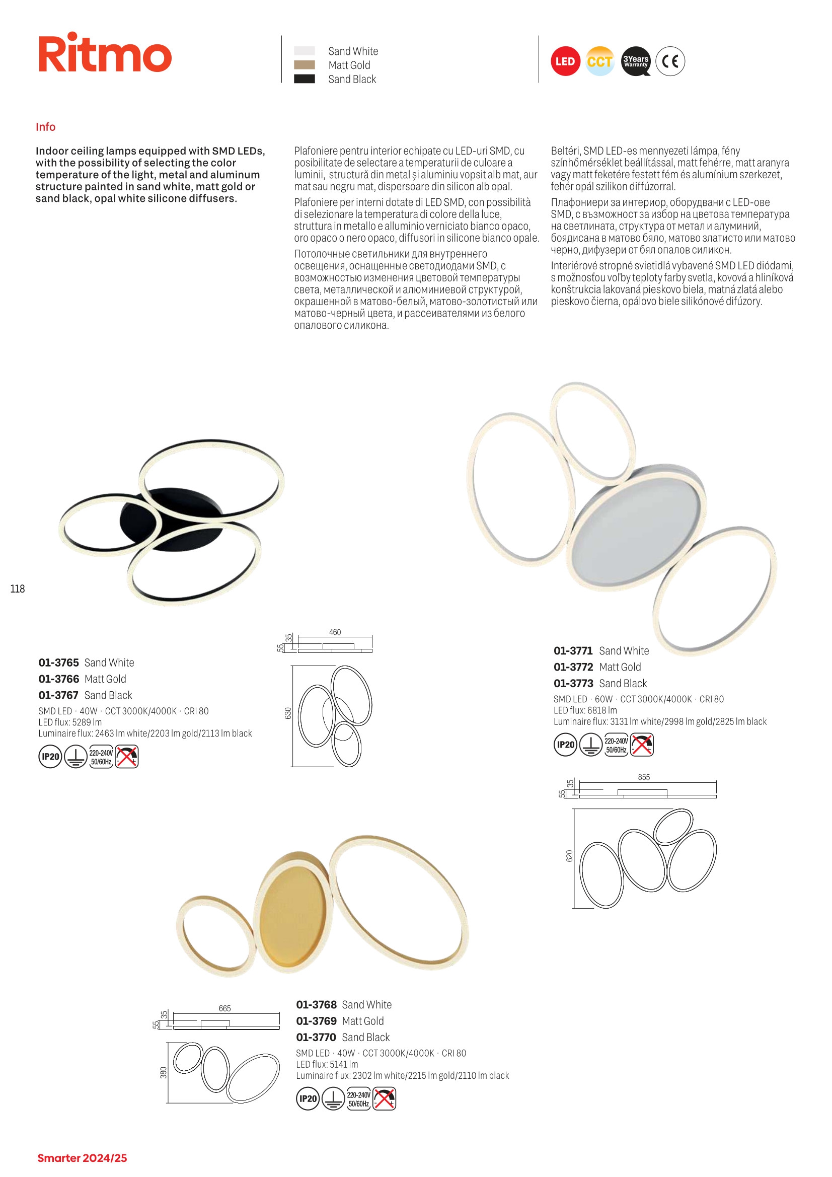 Лед плафон 01-3770 ще осигури комфорт и естетика във всяко помещение, в което се постави. Цялостната визия и дизайн на led лампата и вложените в изработката й материали, като метал и алуминий в матово черен цвят, дифузери от опалово бял силикон, CCT 3000K/4000K, ще допринесат за един неповторим стил. Благодарение на дългогодишния опит в производството на лед осветление, качествените материали и строгия контрол на качеството на изработка на дизайнерската линия Redo Smarter на производителя Redo (Румъния), 01-3770 е на високо европейско ниво.
