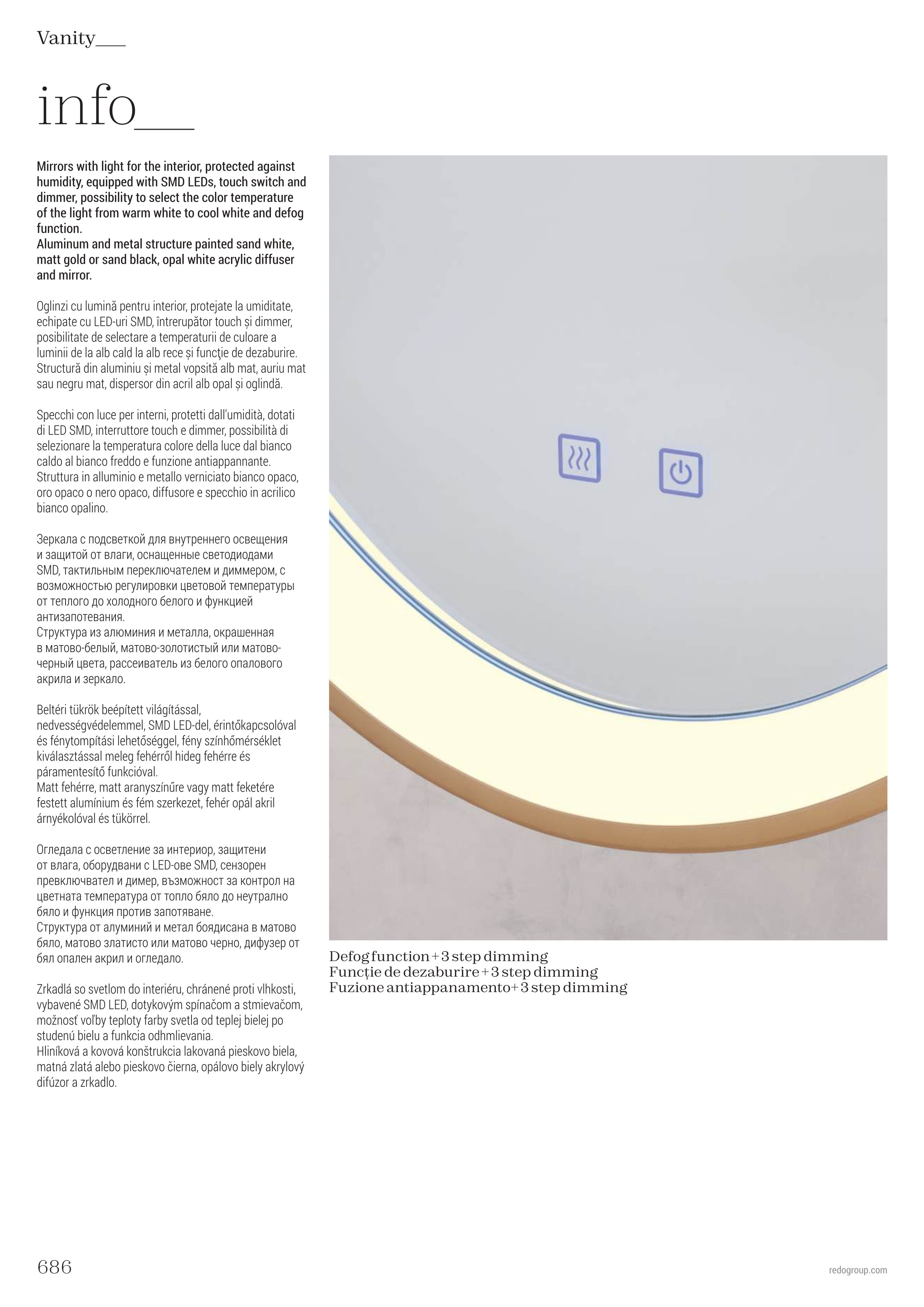 Осветителното тяло 01-3821 ще осигури комфорт и естетика във всяко помещение, в което се постави. Цялостната визия и дизайн на лампата и вложените в изработката й материали, като овално огледало от алуминий и метал с осветление в матово бяло, дифузер от опалово бял акрил, сензорен контрол за запотяване, димер и CCT 3000K/4000K/6000K, ще допринесат за един неповторим стил. Благодарение на дългогодишния опит, качествените материали и строгия контрол на качеството на изработка на дизайнерската линия Redo Indoor на производителя Redo (Румъния), 01-3821 е на високо европейско ниво.