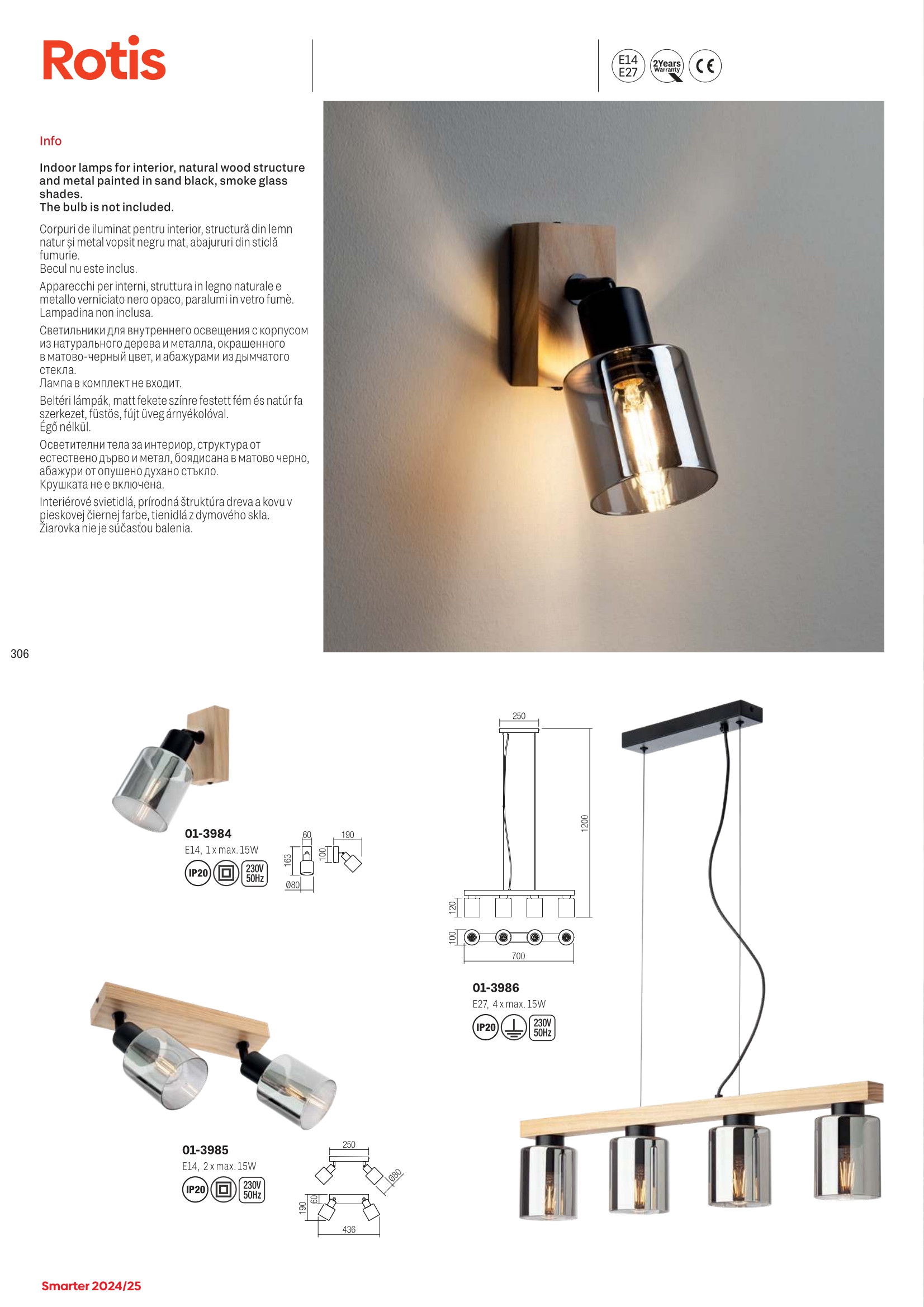 Осветителното тяло 01-3984 ще осигури комфорт и естетика във всяко помещение, в което се постави. Цялостната визия и дизайн на лампата и вложените в изработката й материали, като естествено дърво, метал в матово черен цвят, насочващ се абажур от опушено духано стъкло, ще допринесат за един неповторим стил. Благодарение на дългогодишния опит, качествените материали и строгия контрол на качеството на изработка на дизайнерската линия Redo Smarter на производителя Redo (Румъния), 01-3984 е на високо европейско ниво.