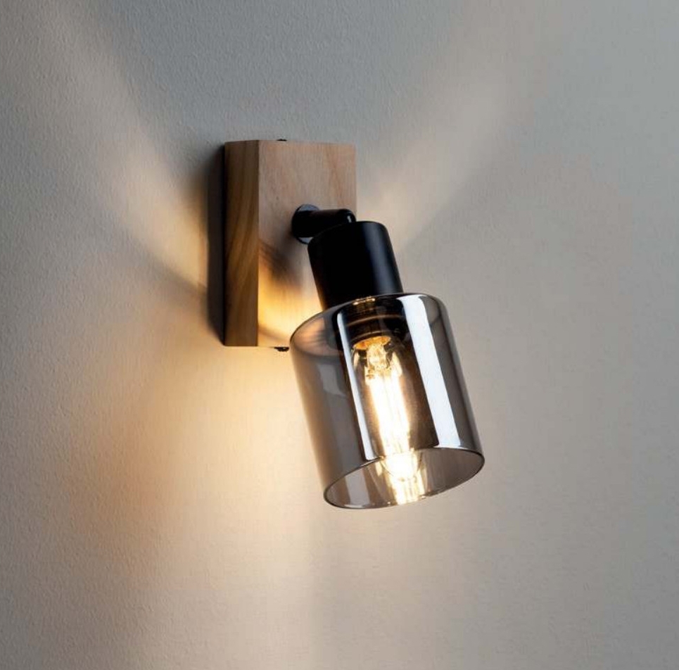 естествено дърво, метал в матово черен цвят, насочващ се абажур от опушено духано стъкло