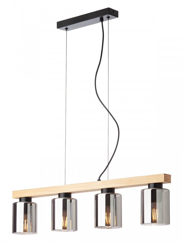 естествено дърво, метал в матово черен цвят, абажури от опушено духано стъкло