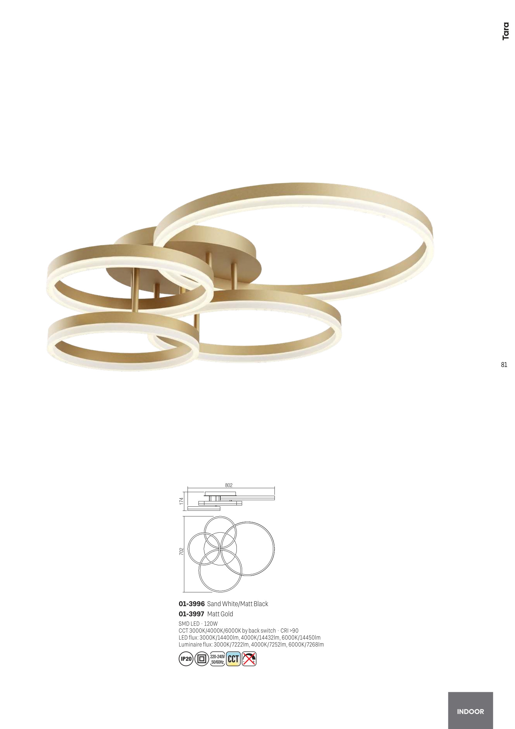 Лед плафон 01-3996 ще осигури комфорт и естетика във всяко помещение, в което се постави. Цялостната визия и дизайн на led лампата и вложените в изработката й материали, като метална основа в цвят матово бяло, алуминиева структура в матово черно, дифузери от сатениран акрил, CCT 3000K/4000K/6000K, ще допринесат за един неповторим стил. Благодарение на дългогодишния опит в производството на лед осветление, качествените материали и строгия контрол на качеството на изработка на дизайнерската линия Redo Smarter на производителя Redo (Румъния), 01-3996 е на високо европейско ниво.