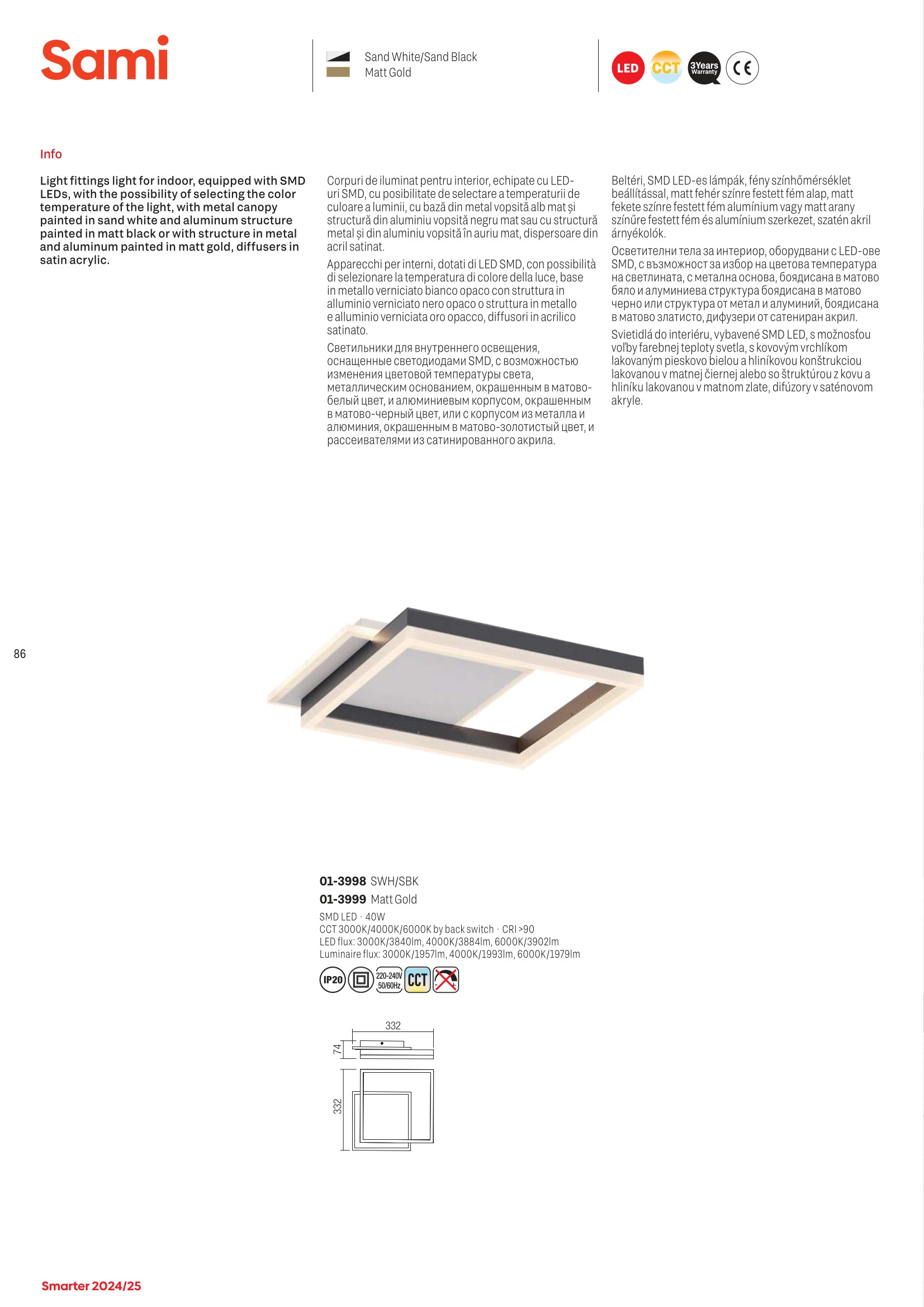 метална основа в матово бяло, алуминиева структура в матово черно, дифузер от сатениран акрил, CCT 3000K/4000K/6000K
