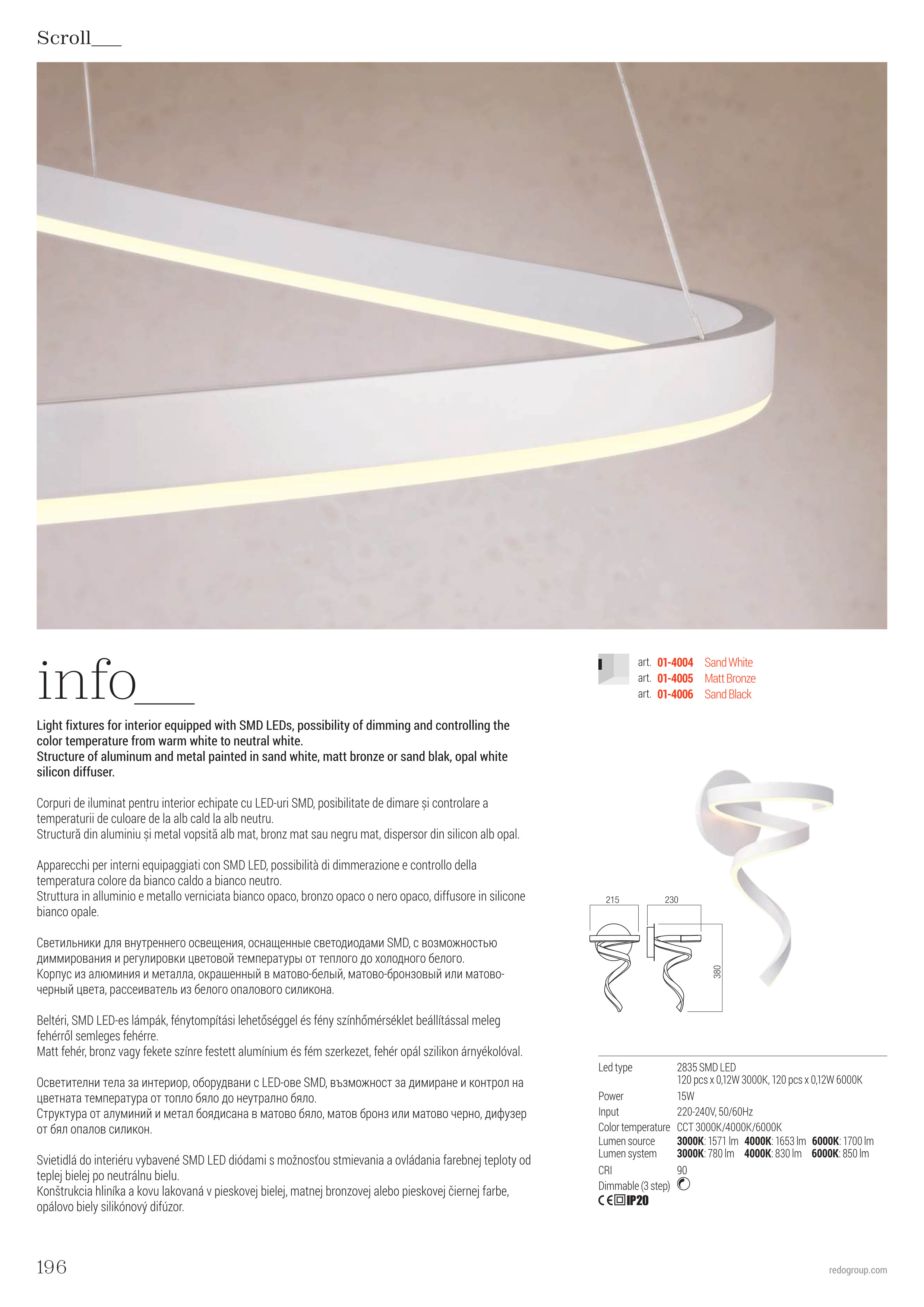 Осветителното тяло 01-4004 ще осигури комфорт и естетика във всяко помещение, в което се постави. Цялостната визия и дизайн на лампата и вложените в изработката й материали, като алуминий и метал в матово бял цвят, възможност за димиране и смяна на цветната температура CCT 3000K/4000K/6000K, ще допринесат за един неповторим стил. Благодарение на дългогодишния опит, качествените материали и строгия контрол на качеството на изработка на дизайнерската линия Redo Indoor на производителя Redo (Румъния), 01-4004 е на високо европейско ниво.