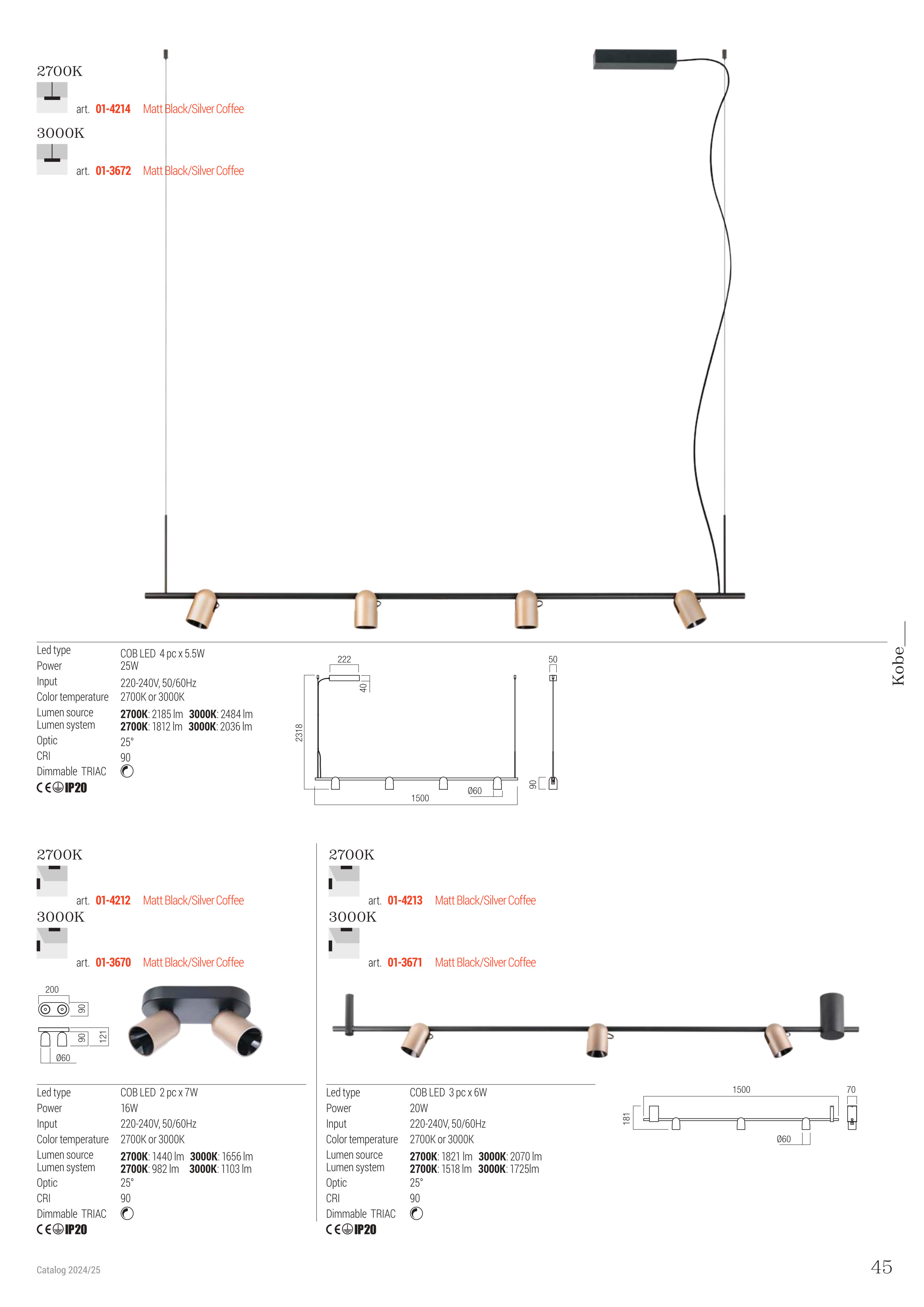 екструдиран алуминий и метал в матово черен цвят и спотове в цвят сребристо кафе, дифузери от прозрачен поликарбонат