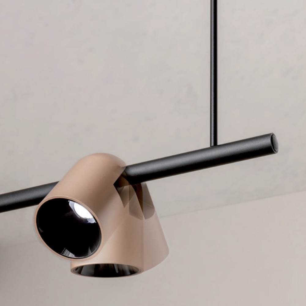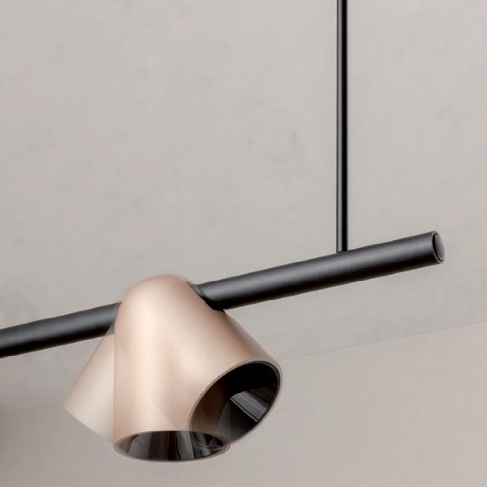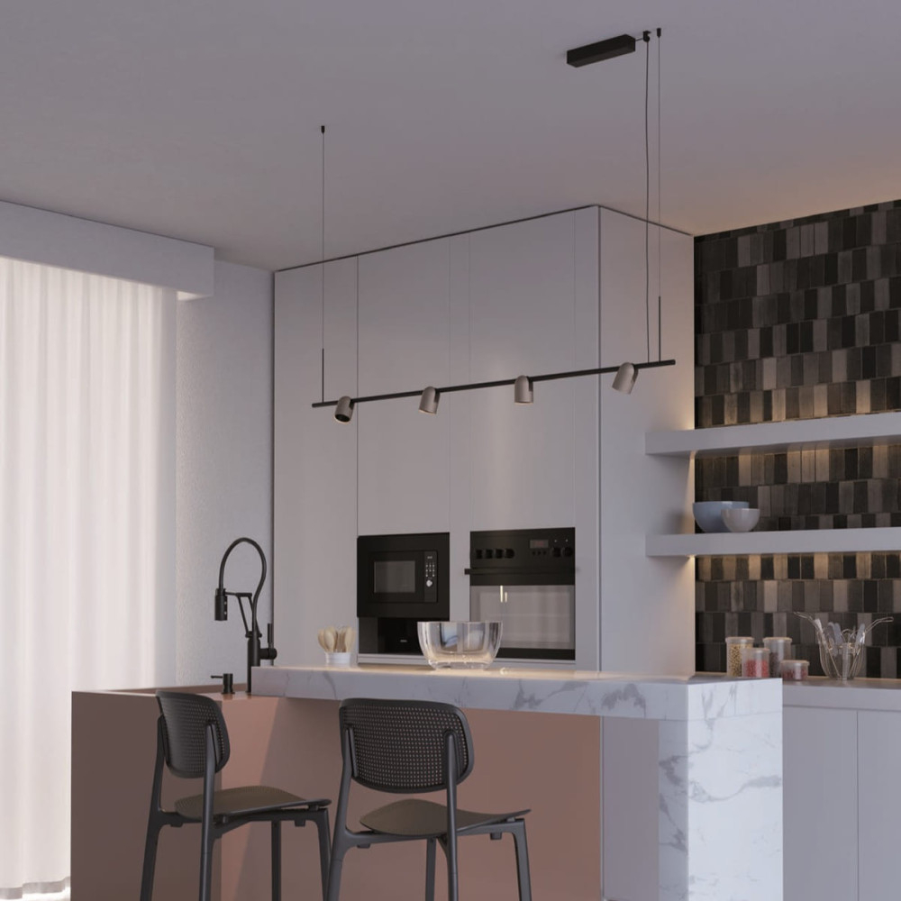 екструдиран алуминий и метал в матово черен цвят и спотове в цвят сребристо кафе, дифузери от прозрачен поликарбонат