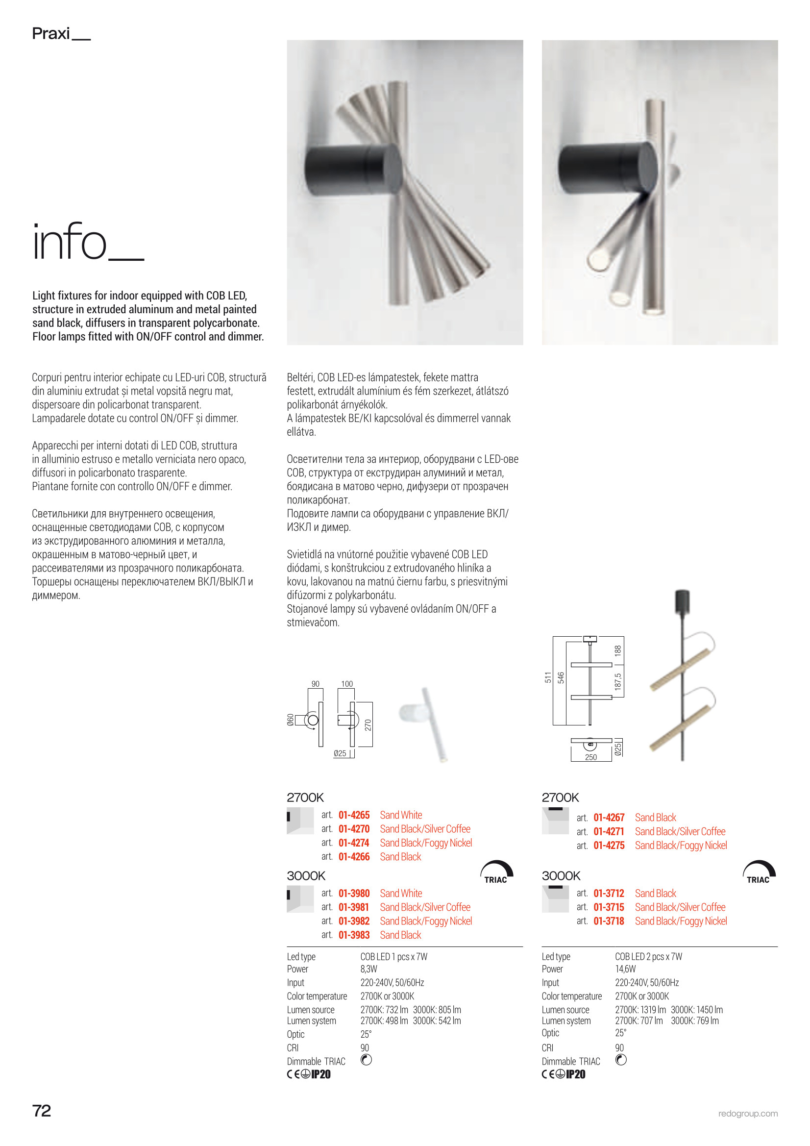 Лед лампион / правостояща лампа, спот лампа 01-4401 ще осигури комфорт и естетика във всяко помещение, в което се постави. Цялостната визия и дизайн на led лампата и вложените в изработката й материали, като есктрудиран алуминий и метал в матово черно и в цвят сребристо кафе, дифузер от прозрачен поликарбонат, регулируемо насочване, димиране с докосване, ще допринесат за един неповторим стил. Благодарение на дългогодишния опит в производството на лед осветление, качествените материали и строгия контрол на качеството на изработка на дизайнерската линия Redo Indoor на производителя Redo (Румъния), 01-4401 е на високо европейско ниво.