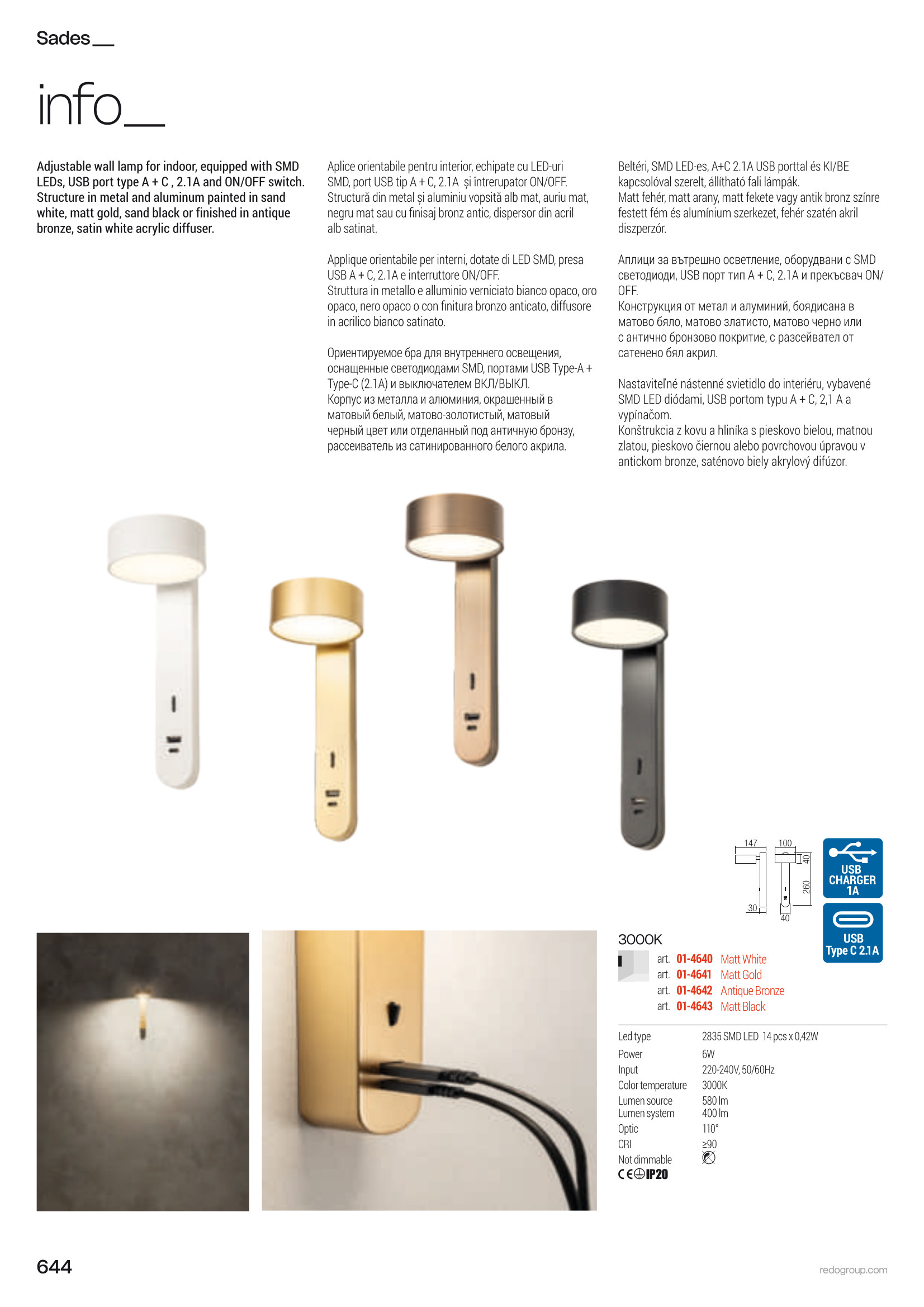 Лед аплик 01-4641 ще осигури комфорт и естетика във всяко помещение, в което се постави. Цялостната визия и дизайн на led лампата и вложените в изработката й материали, като метал и алуминий в матово златисто, разсейвател от акрил в сатенено бял цвят, USB порт тип A + C, 2.1A и прекъсвач ON/OFF, ще допринесат за един неповторим стил. Благодарение на дългогодишния опит в производството на лед осветление, качествените материали и строгия контрол на качеството на изработка на дизайнерската линия Redo Indoor на производителя Redo (Румъния), 01-4641 е на високо европейско ниво.