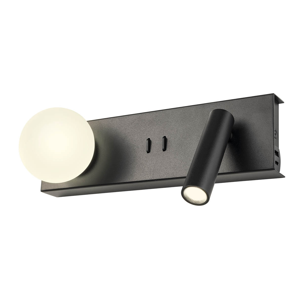 метал и алуминий в цвят черен мат, USB порт тип A + C, 2.1A и прекъсвачи ON/OFF, разсейвател от матирано опалово бяло стъкло