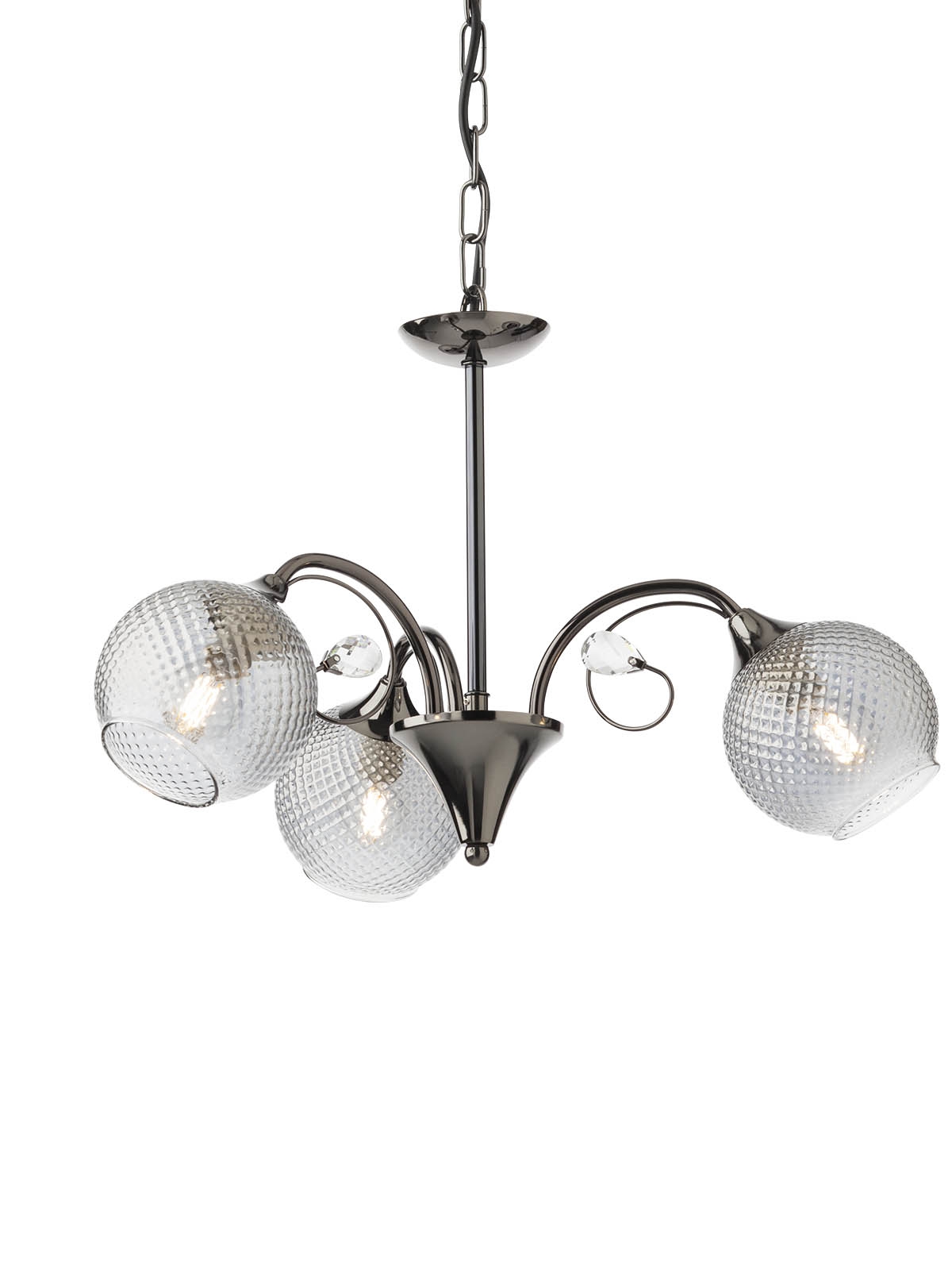 метал в тъмен хром (gun metal), прозрачен стъклен орнамент, абажури от опушено стъкло