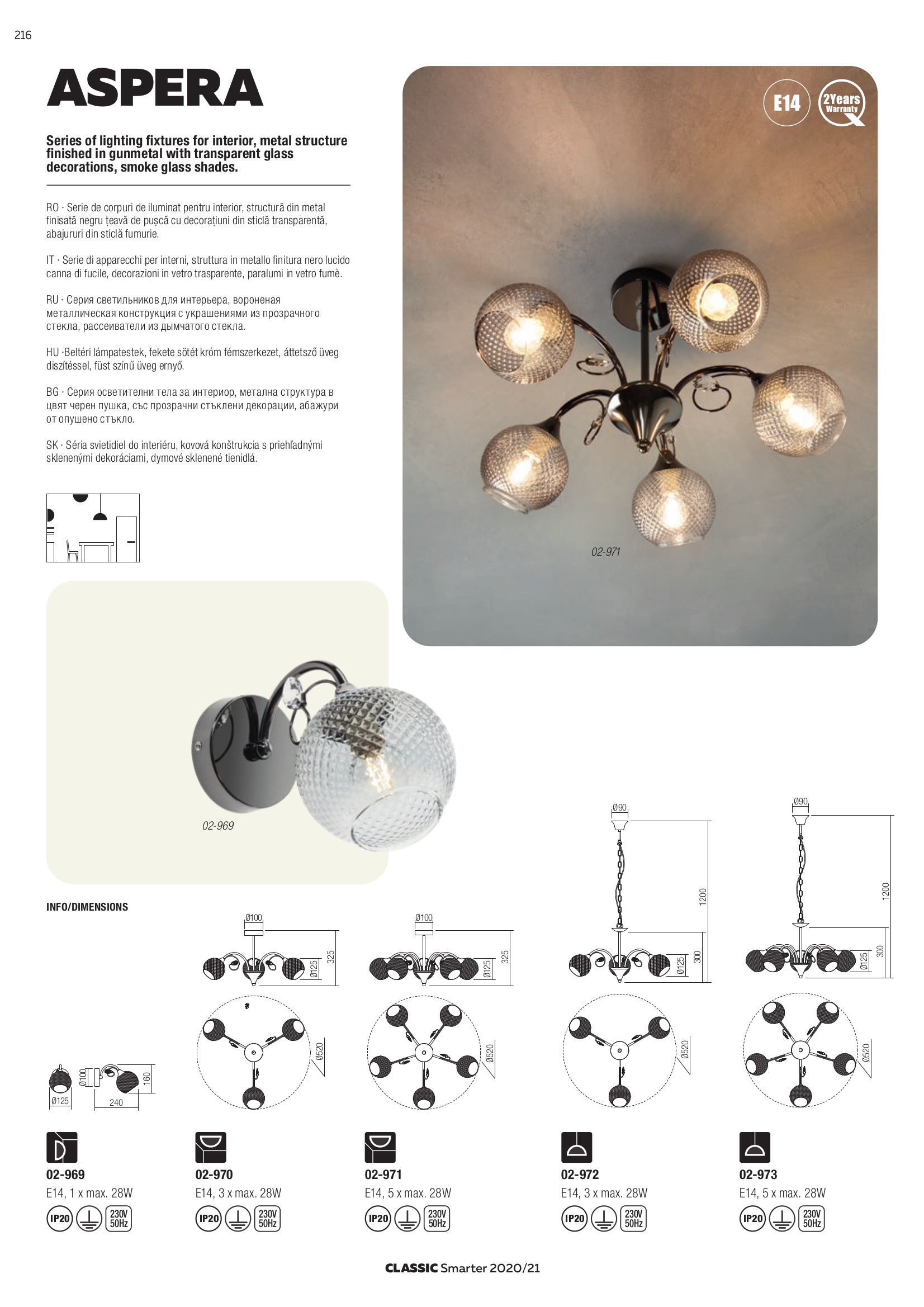 Осветителното тяло 02-973 ще осигури комфорт и естетика във всяко помещение, в което се постави. Цялостната визия и дизайн на лампата и вложените в изработката й материали, като метал в тъмен хром (gun metal), прозрачен стъклен орнамент, абажур от опушено стъкло, ще допринесат за един неповторим стил. Благодарение на дългогодишния опит, качествените материали и строгия контрол на качеството на изработка на дизайнерската линия Redo Smarter на производителя Redo (Румъния), 02-973 е на високо европейско ниво.