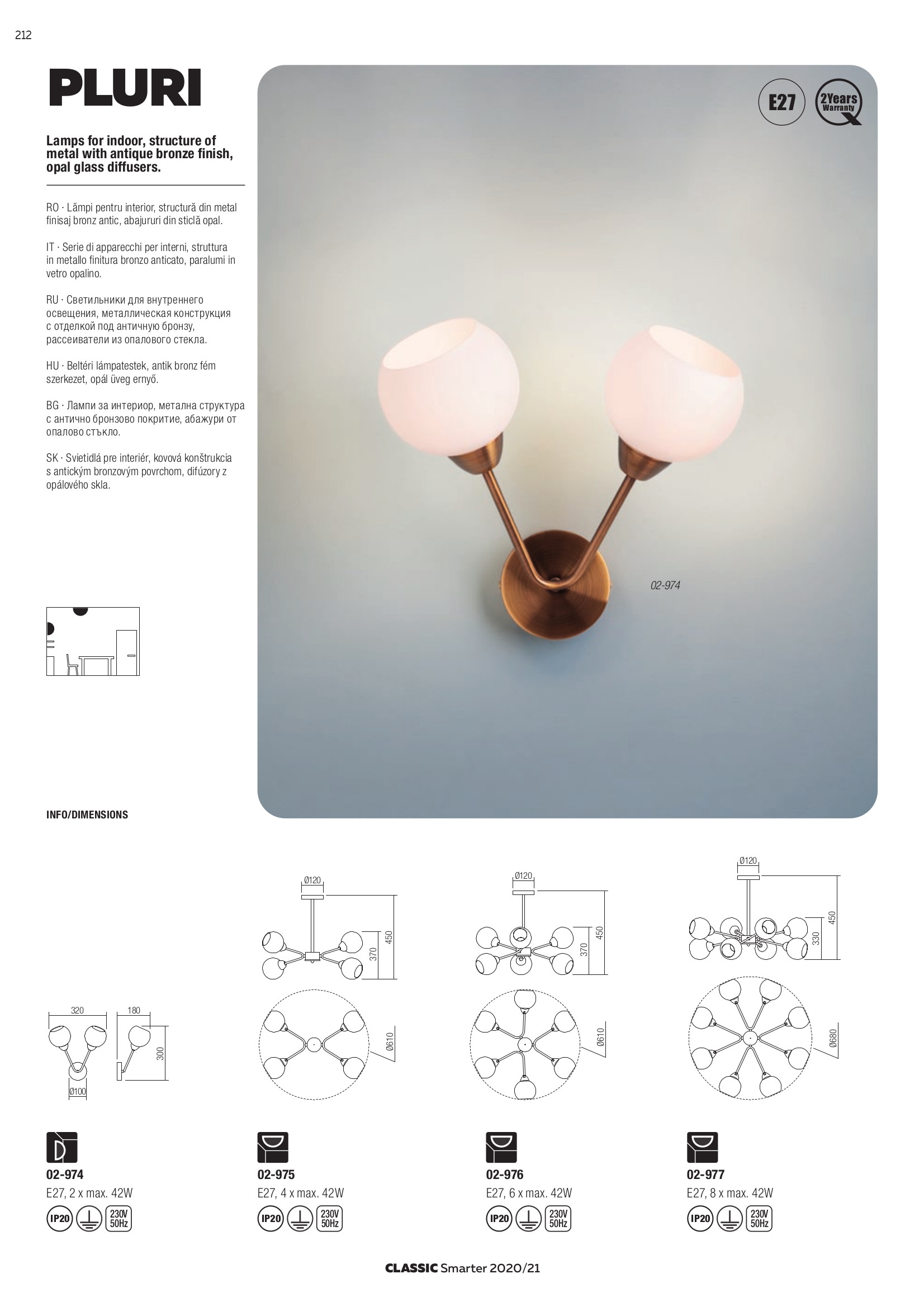 Осветителното тяло 02-976 ще осигури комфорт и естетика във всяко помещение, в което се постави. Цялостната визия и дизайн на лампата и вложените в изработката й материали, като метал в цвят античен бронз, абажури от опалово бяло стъкло, ще допринесат за един неповторим стил. Благодарение на дългогодишния опит, качествените материали и строгия контрол на качеството на изработка на дизайнерската линия Redo Smarter на производителя Redo (Румъния), 02-976 е на високо европейско ниво.