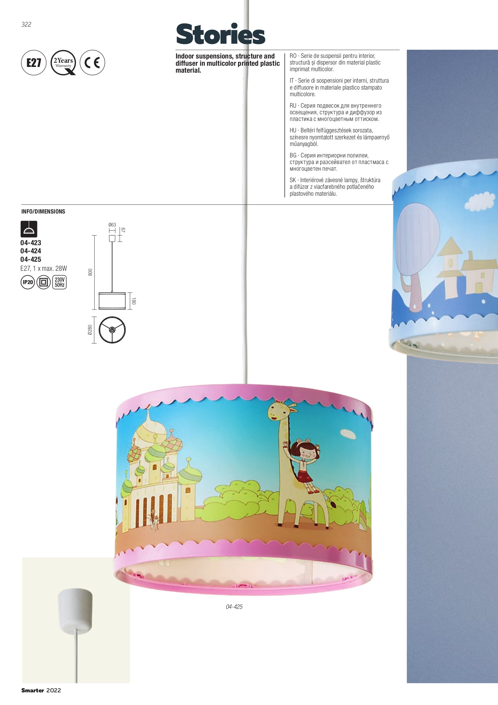 Осветителното тяло 04-423 представлява пендел в съвременен стил. 04-423 е от категорията осветителни тела и е подходящо за осветяване на различни помещения и пространства като: детска стая.