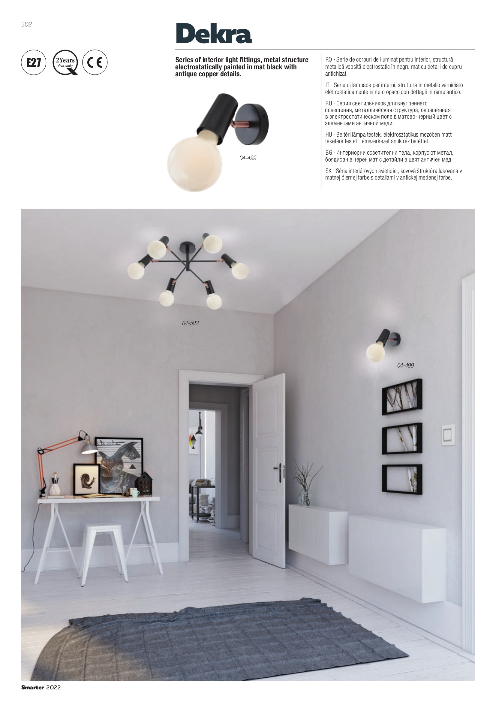 Осветителното тяло 04-500 ще осигури комфорт и естетика във всяко помещение, в което се постави. Цялостната визия и дизайн на лампата и вложените в изработката й материали, като метал в цвят черен мат, детайли в цвят антична мед, ще допринесат за един неповторим стил. Благодарение на дългогодишния опит, качествените материали и строгия контрол на качеството на изработка на дизайнерската линия Redo Smarter на производителя Redo (Румъния), 04-500 е на високо европейско ниво.