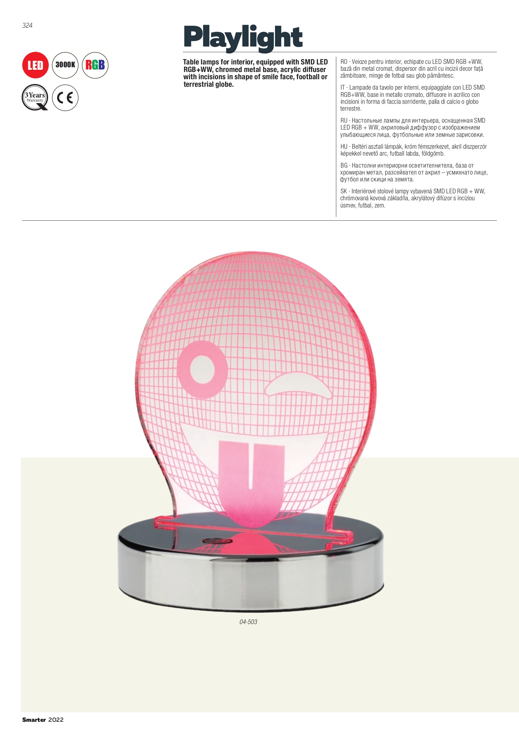 Лед настолна лампа 04-503 ще осигури комфорт и естетика във всяко помещение, в което се постави. Цялостната визия и дизайн на led лампата и вложените в изработката й материали, като хромиран метал, разсейвател на светлината от акрил, RGB, PVC кабел, ключ ON/OFF, ще допринесат за един неповторим стил. Благодарение на дългогодишния опит в производството на лед осветление, качествените материали и строгия контрол на качеството на изработка на дизайнерската линия Redo Smarter на производителя Redo (Румъния), 04-503 е на високо европейско ниво.