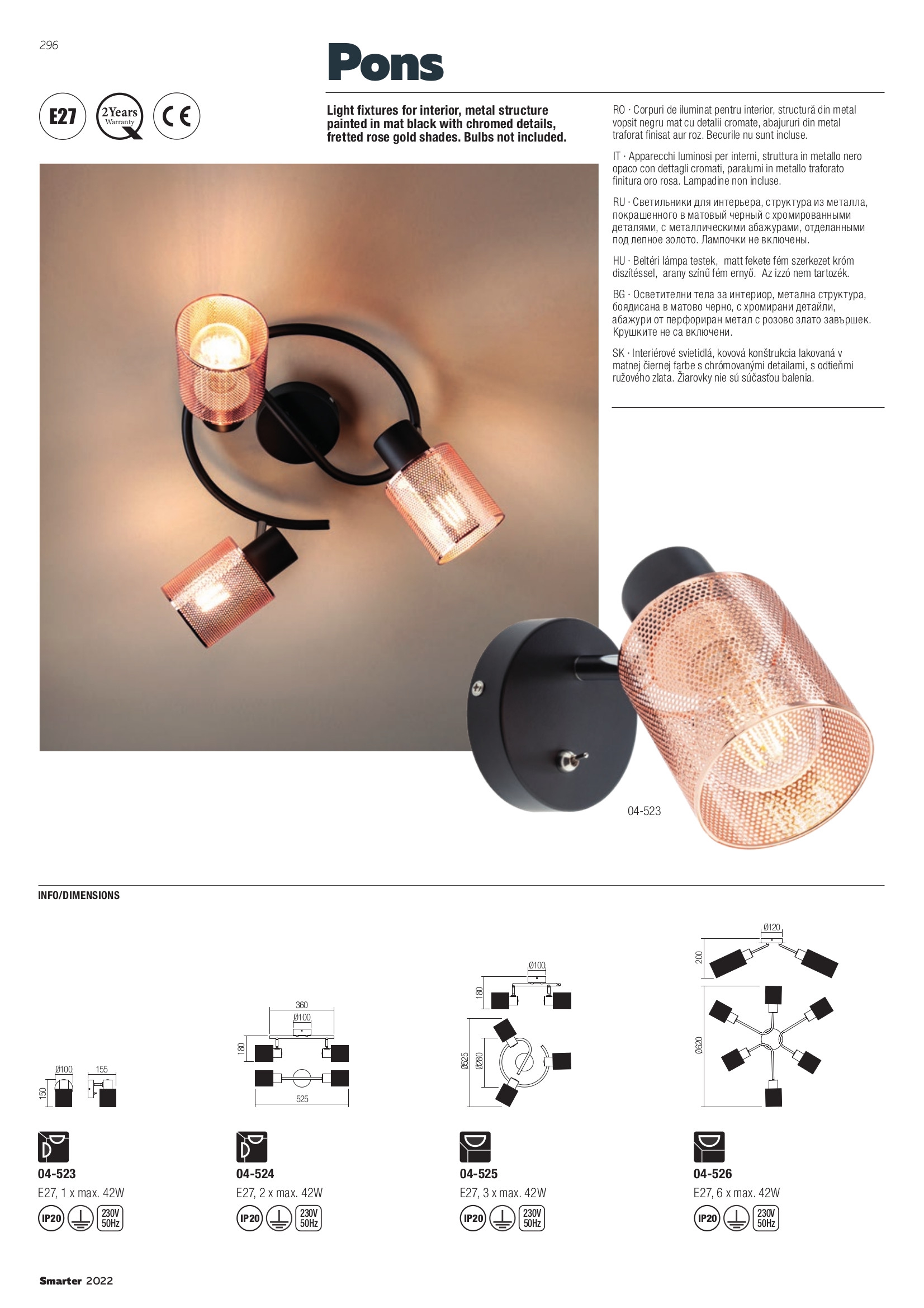 Осветителното тяло 04-524 ще осигури комфорт и естетика във всяко помещение, в което се постави. Цялостната визия и дизайн на лампата и вложените в изработката й материали, като метал в цвят черен мат, хромирани детайли, абажури от перфориран метал в цвят розово злато, ще допринесат за един неповторим стил. Благодарение на дългогодишния опит, качествените материали и строгия контрол на качеството на изработка на дизайнерската линия Redo Smarter на производителя Redo (Румъния), 04-524 е на високо европейско ниво.