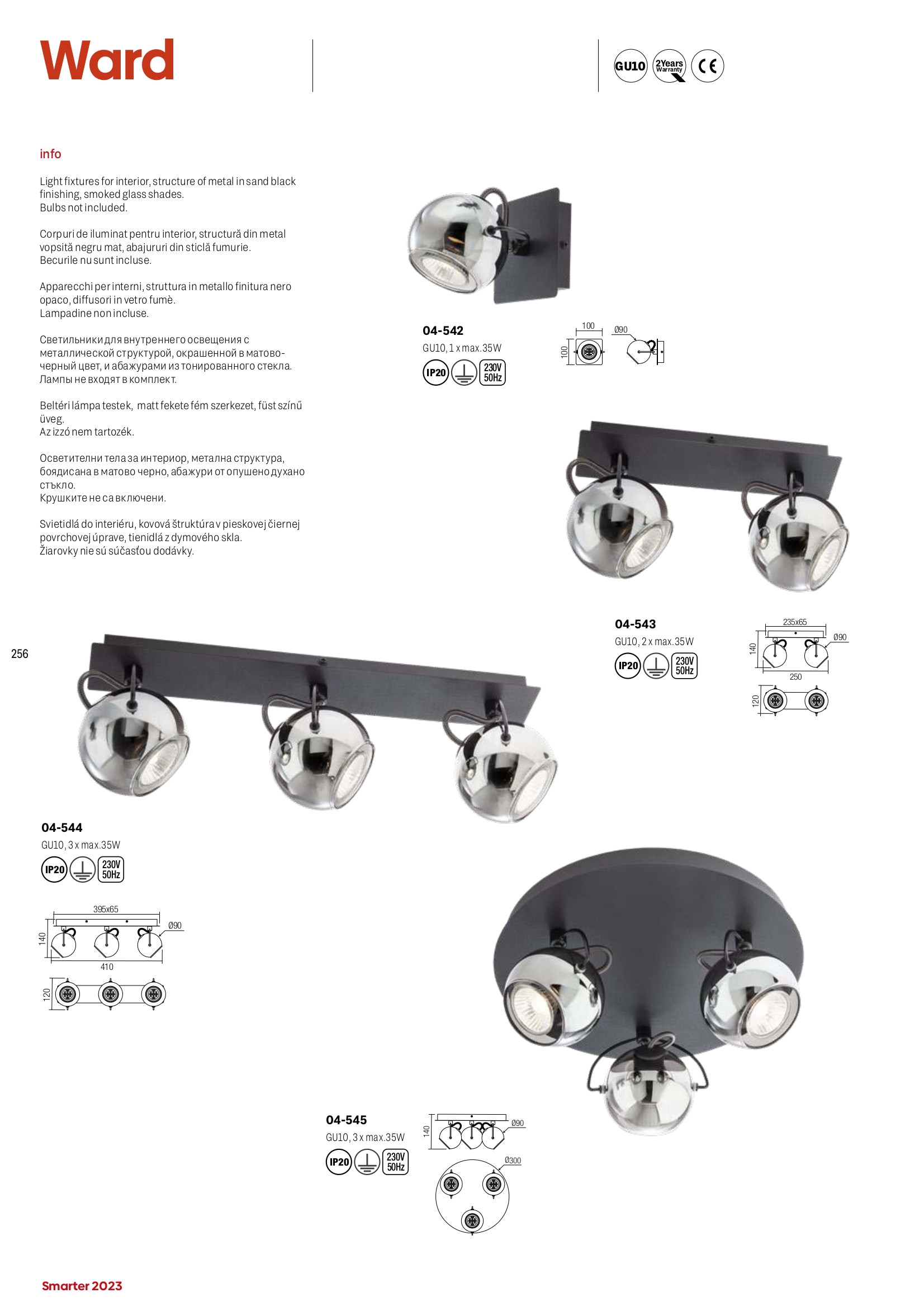 Осветителното тяло 04-543 ще осигури комфорт и естетика във всяко помещение, в което се постави. Цялостната визия и дизайн на лампата и вложените в изработката й материали, като метал с матово черно покритие, абажури от опушено духано стъкло, ще допринесат за един неповторим стил. Благодарение на дългогодишния опит, качествените материали и строгия контрол на качеството на изработка на дизайнерската линия Redo Smarter на производителя Redo (Румъния), 04-543 е на високо европейско ниво.