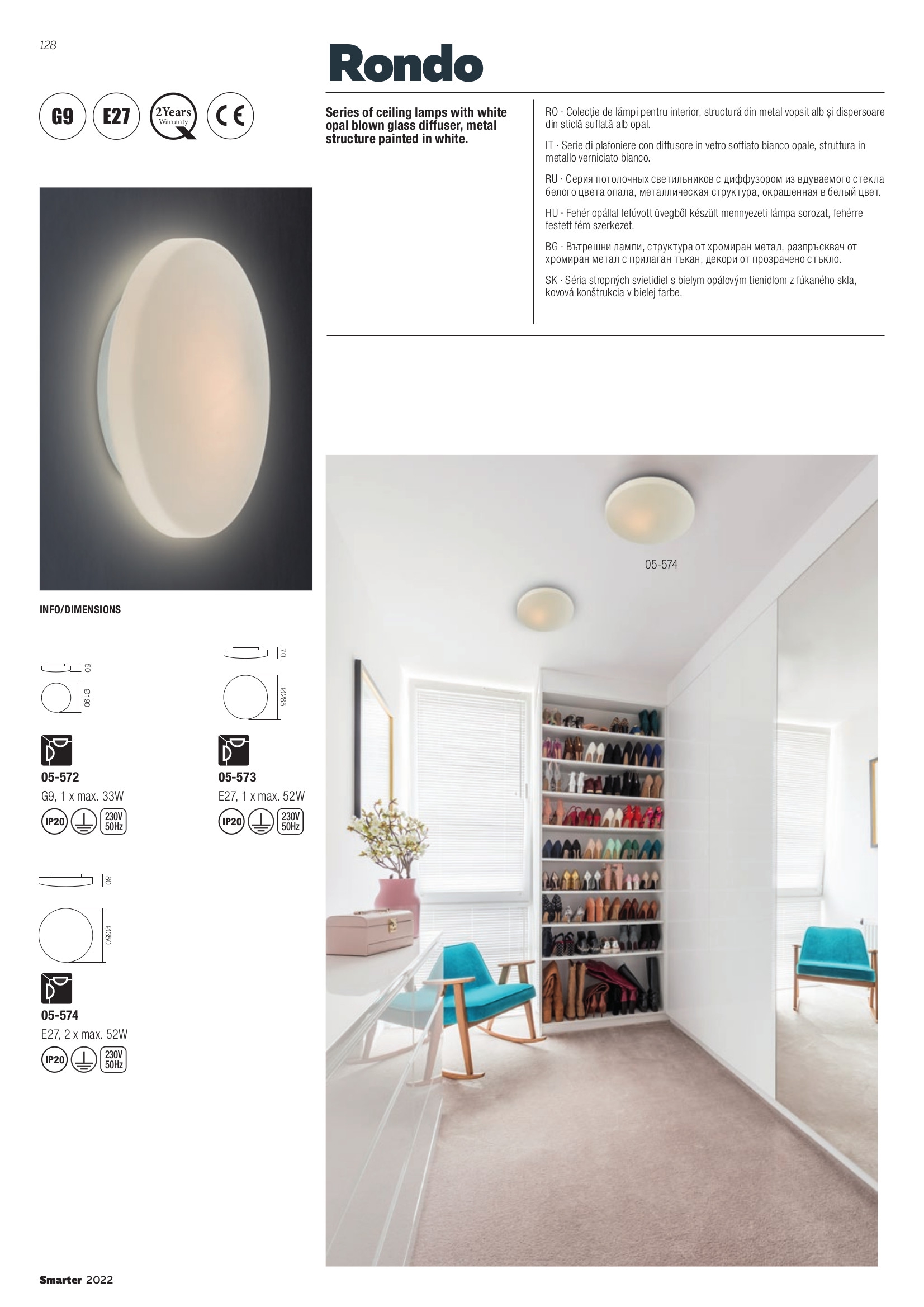 Осветителното тяло 05-574 ще осигури комфорт и естетика във всяко помещение, в което се постави. Цялостната визия и дизайн на лампата и вложените в изработката й материали, като хромиран метал, матово бяло стъкло, ще допринесат за един неповторим стил. Благодарение на дългогодишния опит, качествените материали и строгия контрол на качеството на изработка на дизайнерската линия Redo Smarter на производителя Redo (Румъния), 05-574 е на високо европейско ниво.