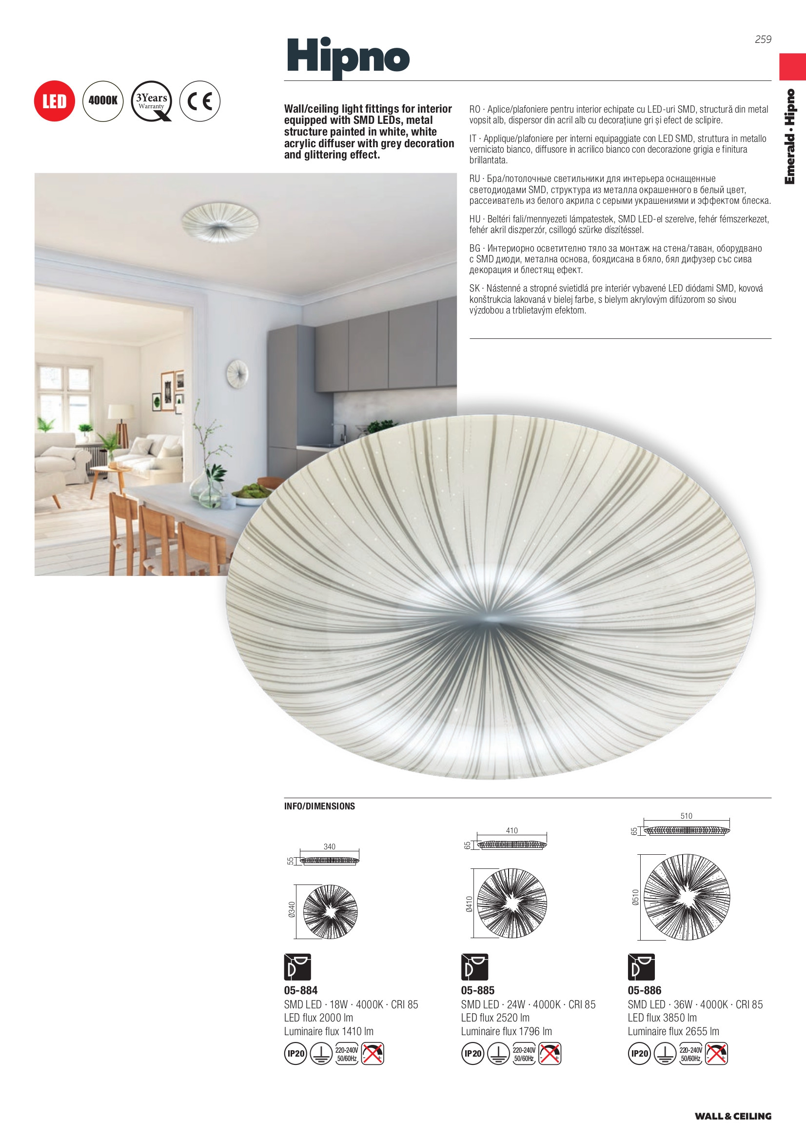 Лед плафон 05-884 ще осигури комфорт и естетика във всяко помещение, в което се постави. Цялостната визия и дизайн на led лампата и вложените в изработката й материали, като метал в бял цвят, бял акрилен дифузер със сива декорация и блестящ ефект, ще допринесат за един неповторим стил. Благодарение на дългогодишния опит в производството на лед осветление, качествените материали и строгия контрол на качеството на изработка на дизайнерската линия Redo Smarter на производителя Redo (Румъния), 05-884 е на високо европейско ниво.