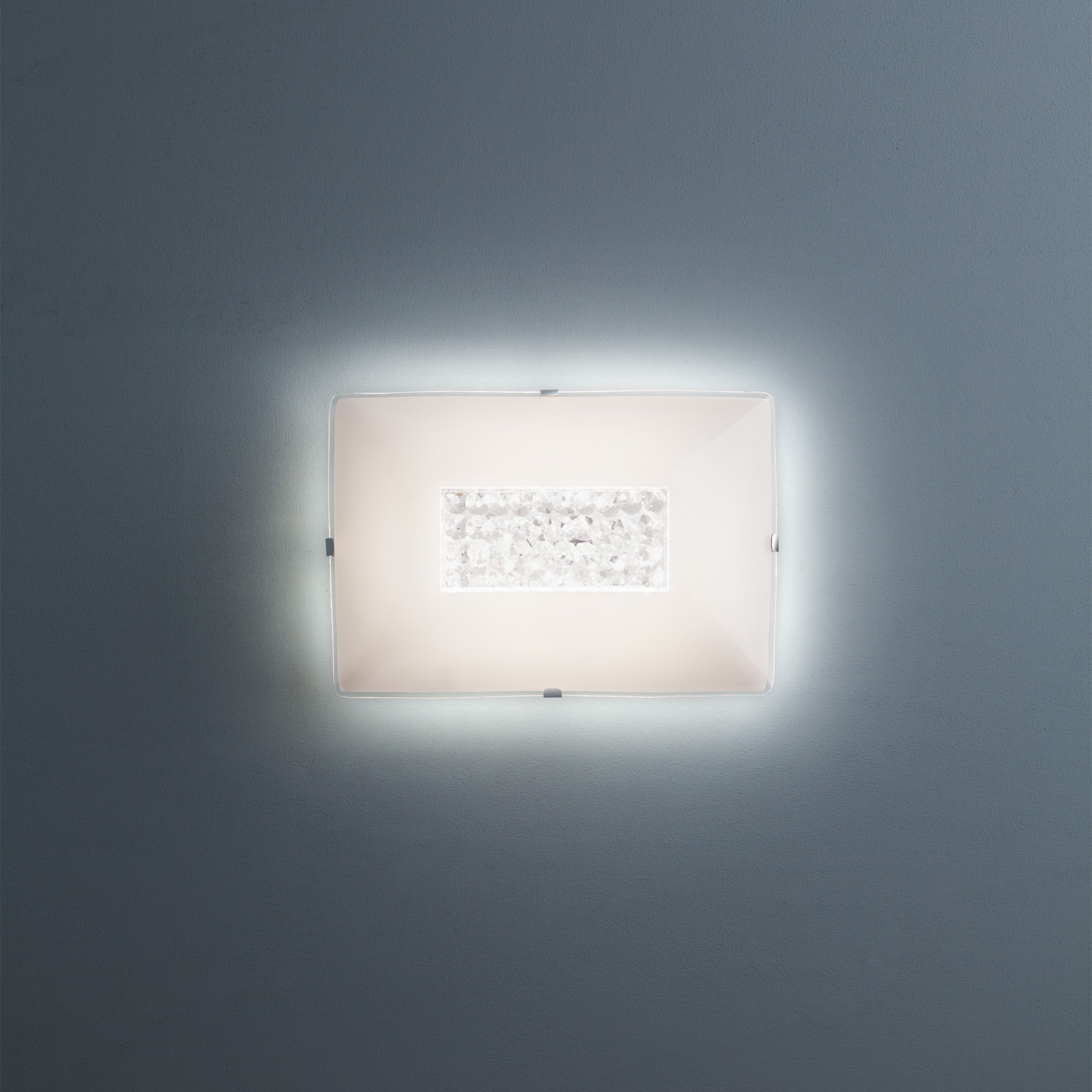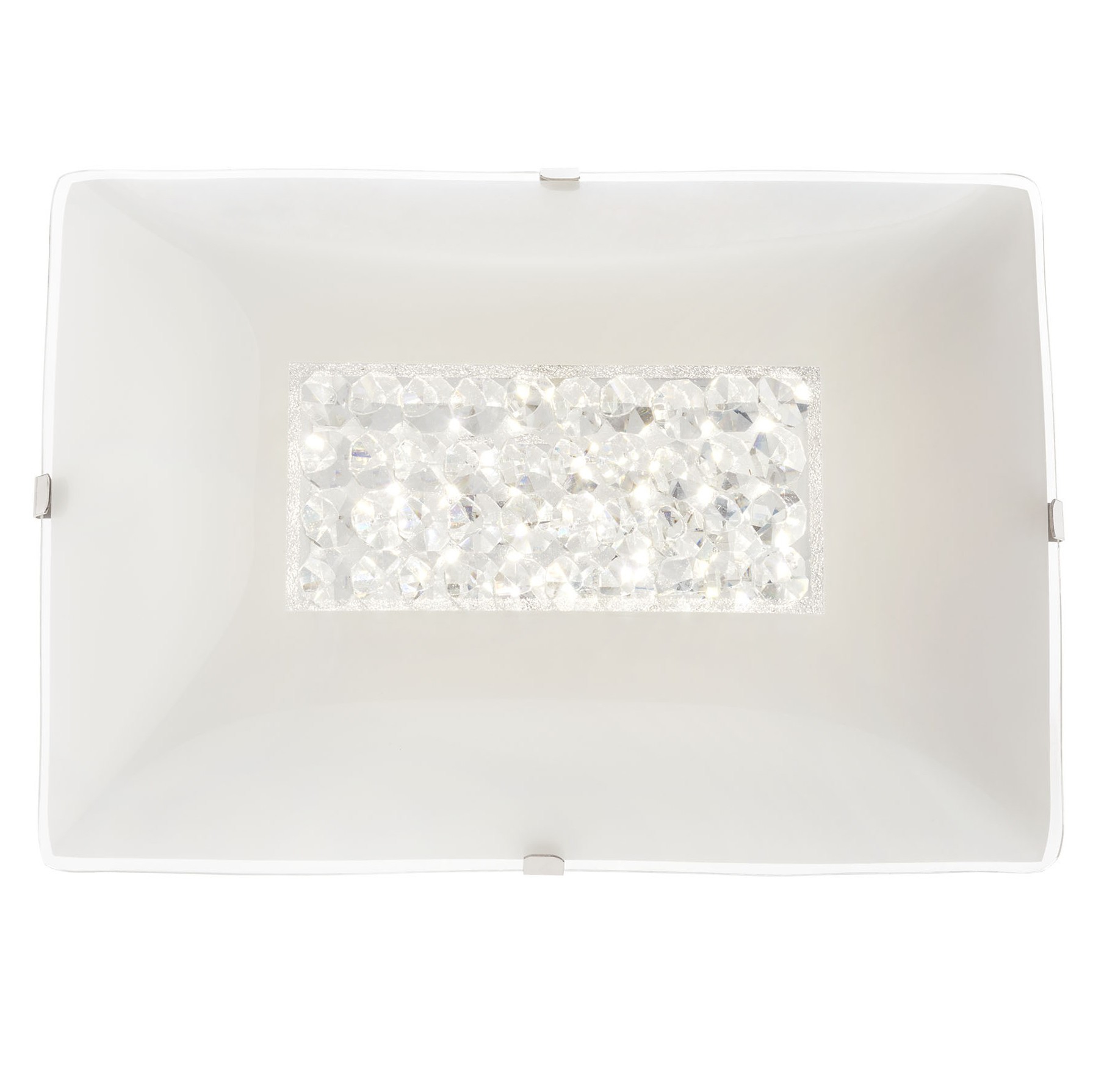 метал в бяло, корниз от огледално стъкло, дифузер от ситопечатно стъкло, кристална декорация в центъра, фиксатори от хромиран метал