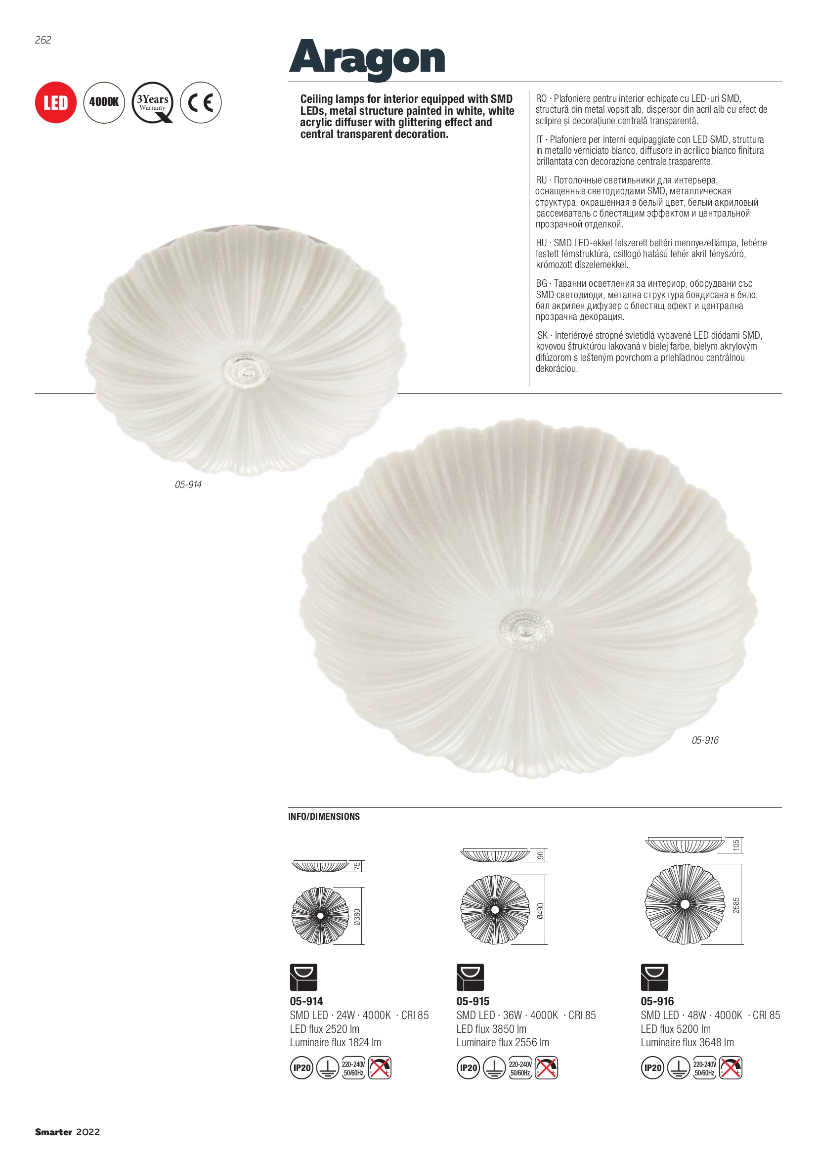 Лед плафон 05-916 ще осигури комфорт и естетика във всяко помещение, в което се постави. Цялостната визия и дизайн на led лампата и вложените в изработката й материали, като метал в бял цвят, дифузер от бял акрил с блестящ ефект, прозрачна декорация от полимер в централната част, ще допринесат за един неповторим стил. Благодарение на дългогодишния опит в производството на лед осветление, качествените материали и строгия контрол на качеството на изработка на дизайнерската линия Redo Smarter на производителя Redo (Румъния), 05-916 е на високо европейско ниво.