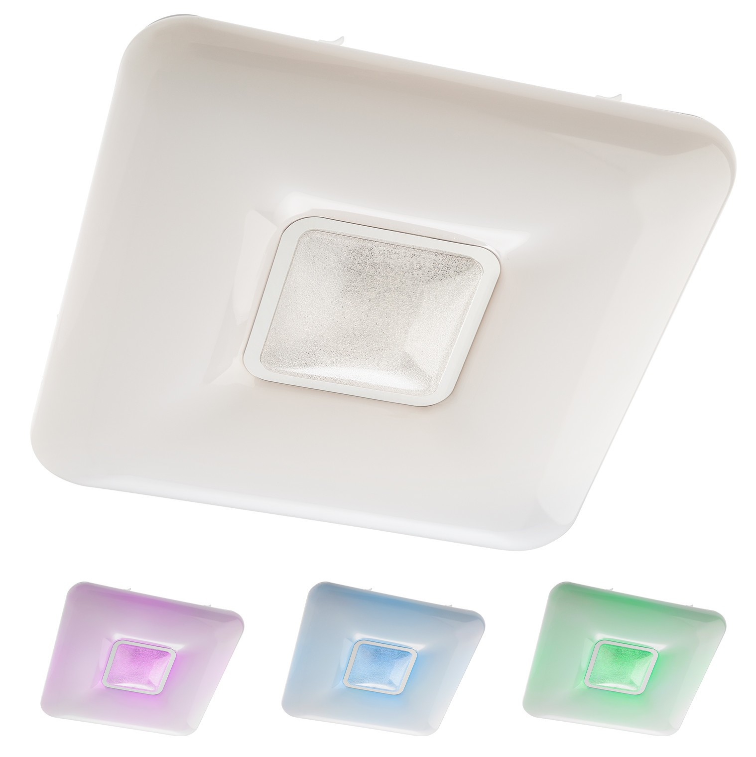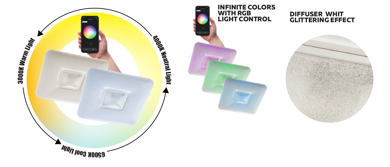метал в матово бяло, дифузьор от полиран опал метакрилат с хромиран орнамент, дистанционно управление (включени 2 AAA батерии), 5 работни програми, регулиране на интензитета на светлината, промяна на цветната температура, RGB, Wi-Fi връзка, нощен режим