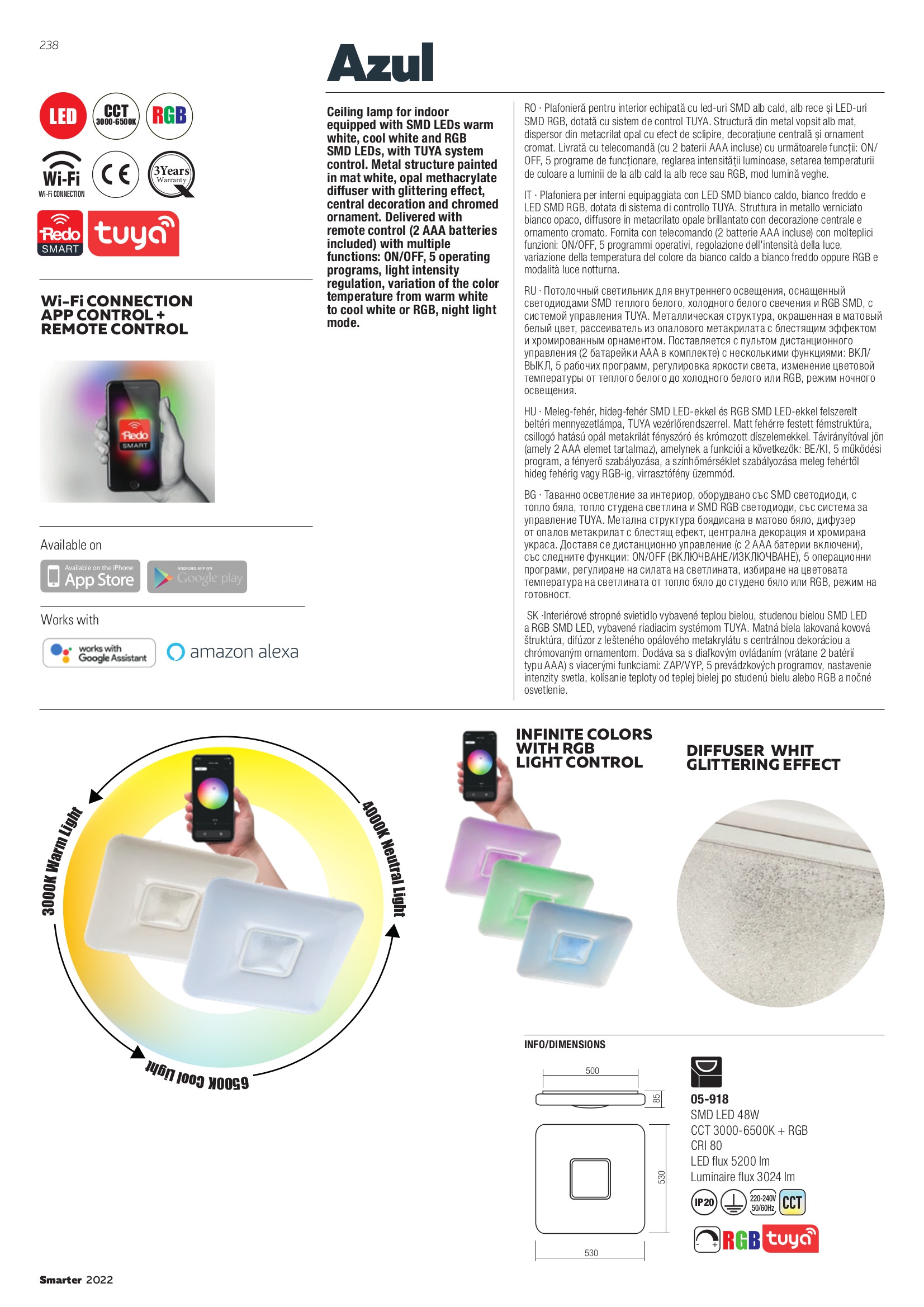 Осветителното тяло 05-918 ще осигури комфорт и естетика във всяко помещение, в което се постави. Цялостната визия и дизайн на лампата и вложените в изработката й материали, като метал в матово бяло, дифузьор от полиран опал метакрилат с хромиран орнамент, дистанционно управление (включени 2 AAA батерии), 5 работни програми, регулиране на интензитета на светлината, промяна на цветната температура, RGB, Wi-Fi връзка, нощен режим, ще допринесат за един неповторим стил. Благодарение на дългогодишния опит, качествените материали и строгия контрол на качеството на изработка на дизайнерската линия Redo Smarter на производителя Redo (Румъния), 05-918 е на високо европейско ниво.