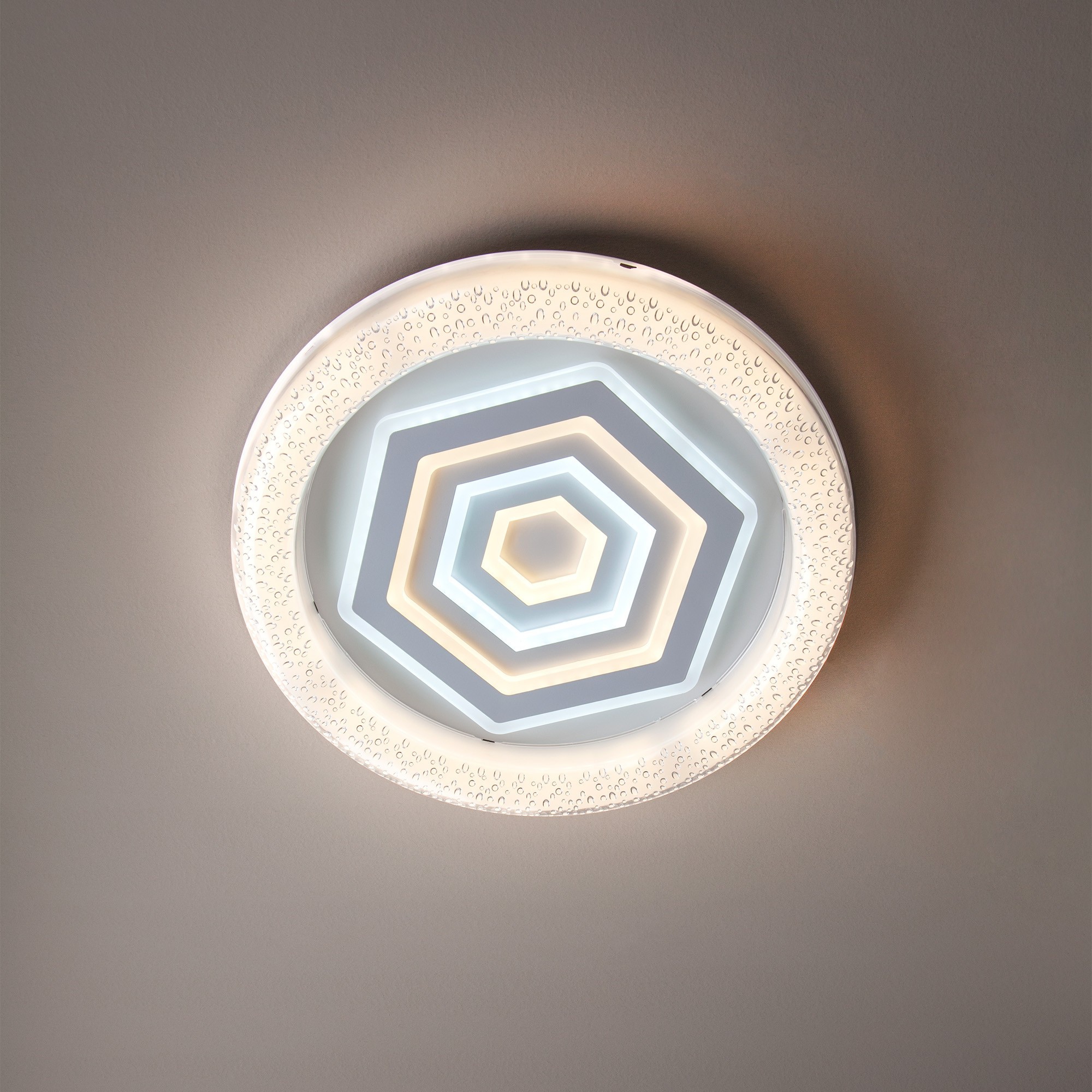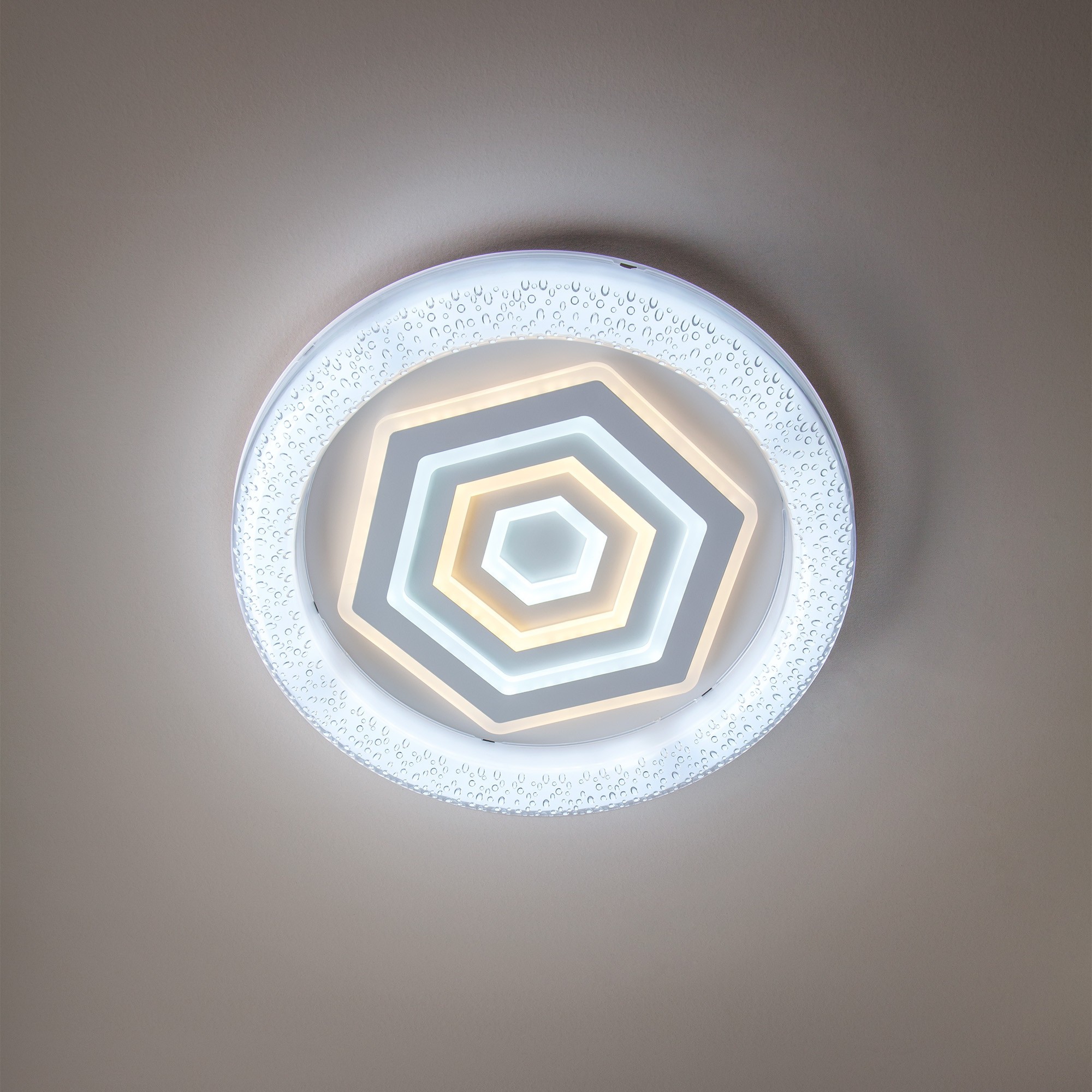 метал в матово бяло, разсейватели от опал акрил и прозрачен акрил с ефект балончета, дистанционно управление (включени 2 AAA батерии), 3 работни програми, регулиране на интензитета на светлината, промяна на цветната температура, нощен режим