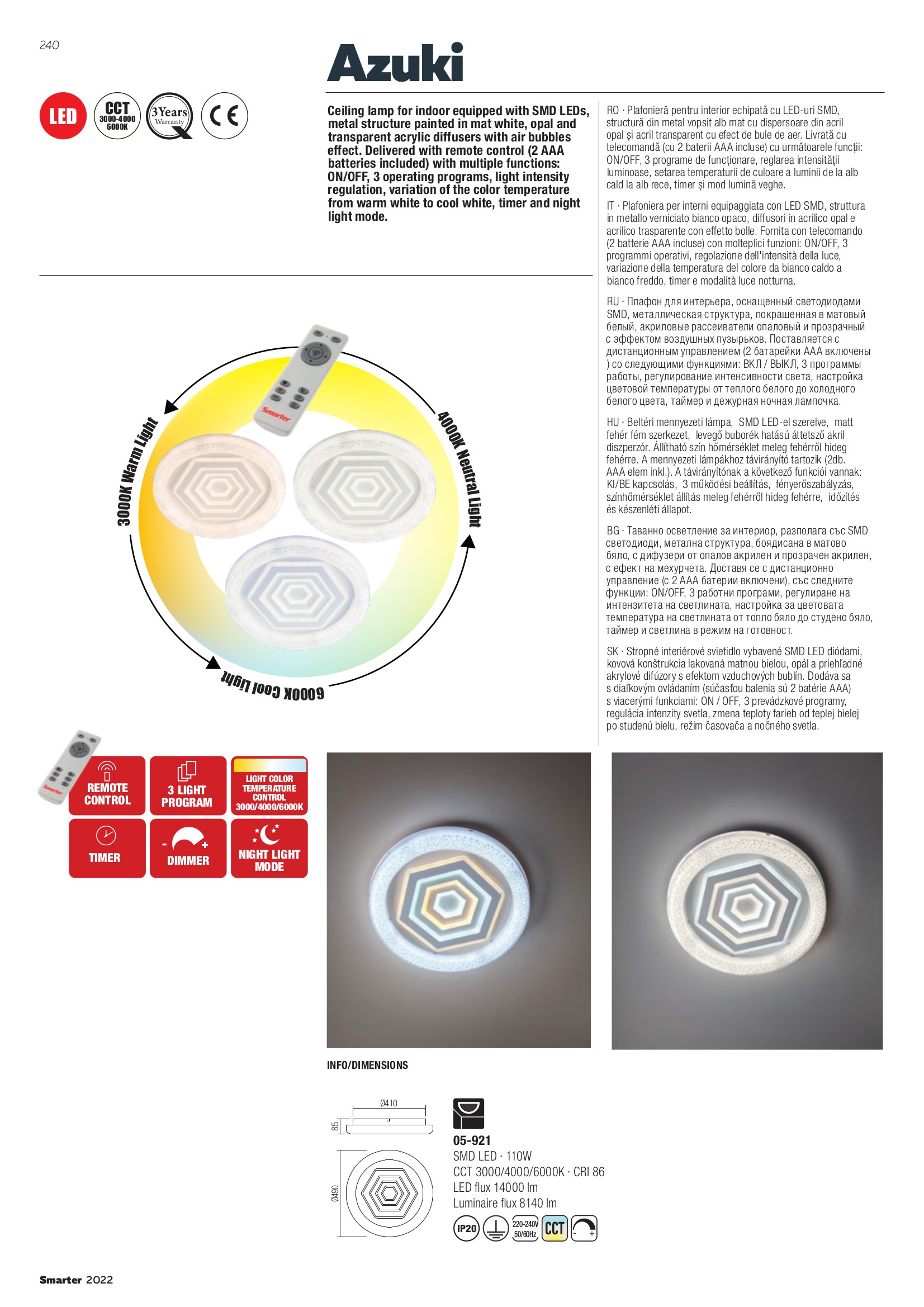 Лед плафон 05-921 ще осигури комфорт и естетика във всяко помещение, в което се постави. Цялостната визия и дизайн на led лампата и вложените в изработката й материали, като метал в матово бяло, разсейватели от опал акрил и прозрачен акрил с ефект балончета, дистанционно управление (включени 2 AAA батерии), 3 работни програми, регулиране на интензитета на светлината, промяна на цветната температура, нощен режим, ще допринесат за един неповторим стил. Благодарение на дългогодишния опит в производството на лед осветление, качествените материали и строгия контрол на качеството на изработка на дизайнерската линия Redo Smarter на производителя Redo (Румъния), 05-921 е на високо европейско ниво.