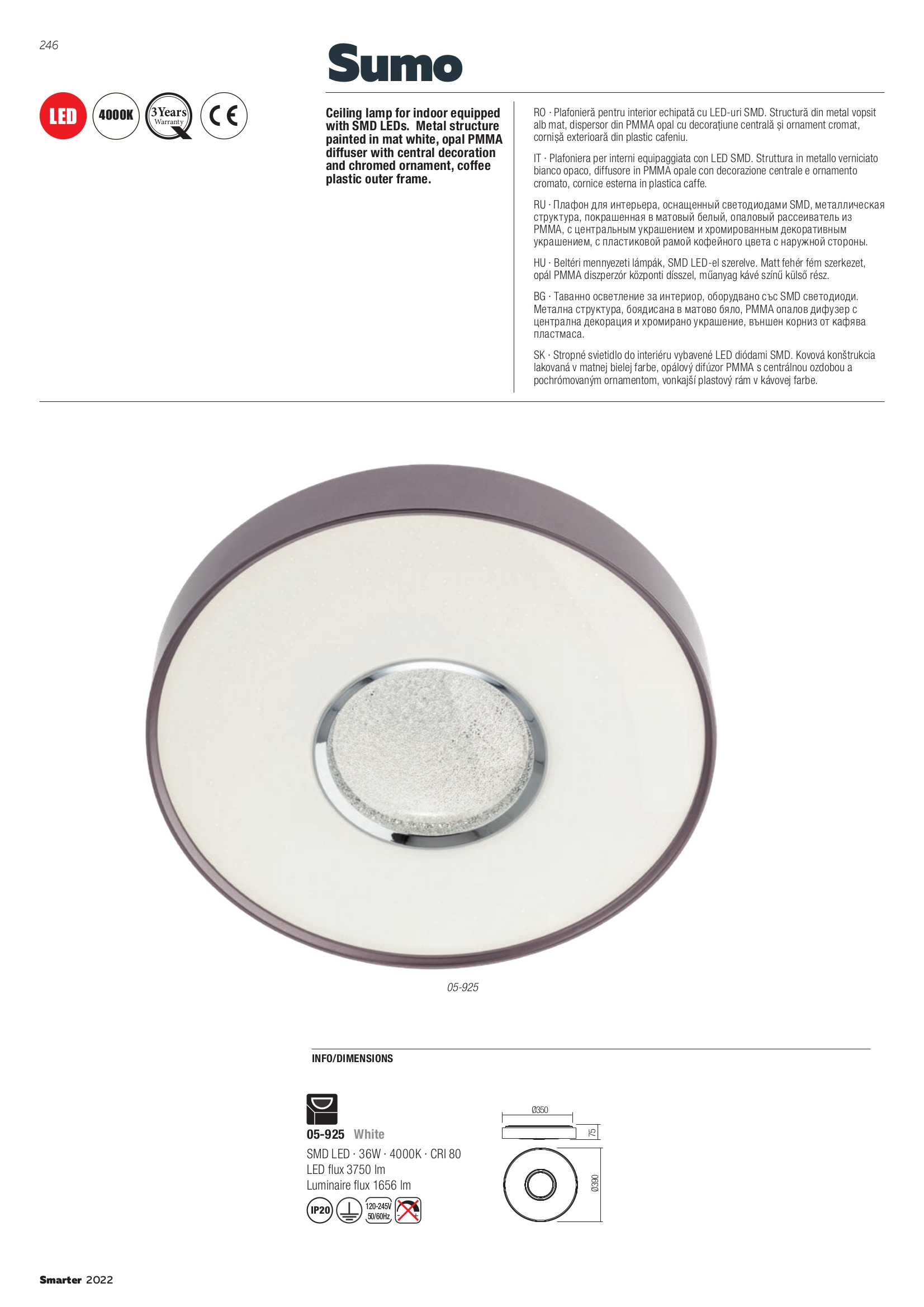 Лед плафон 05-925 ще осигури комфорт и естетика във всяко помещение, в което се постави. Цялостната визия и дизайн на led лампата и вложените в изработката й материали, като метал в матово бяло, дифузер от полимер (РММА) в опалово бяло, централна декорация и хромиран пръстен, външен ринг от полимер в кафяв цвят, ще допринесат за един неповторим стил. Благодарение на дългогодишния опит в производството на лед осветление, качествените материали и строгия контрол на качеството на изработка на дизайнерската линия Redo Smarter на производителя Redo (Румъния), 05-925 е на високо европейско ниво.