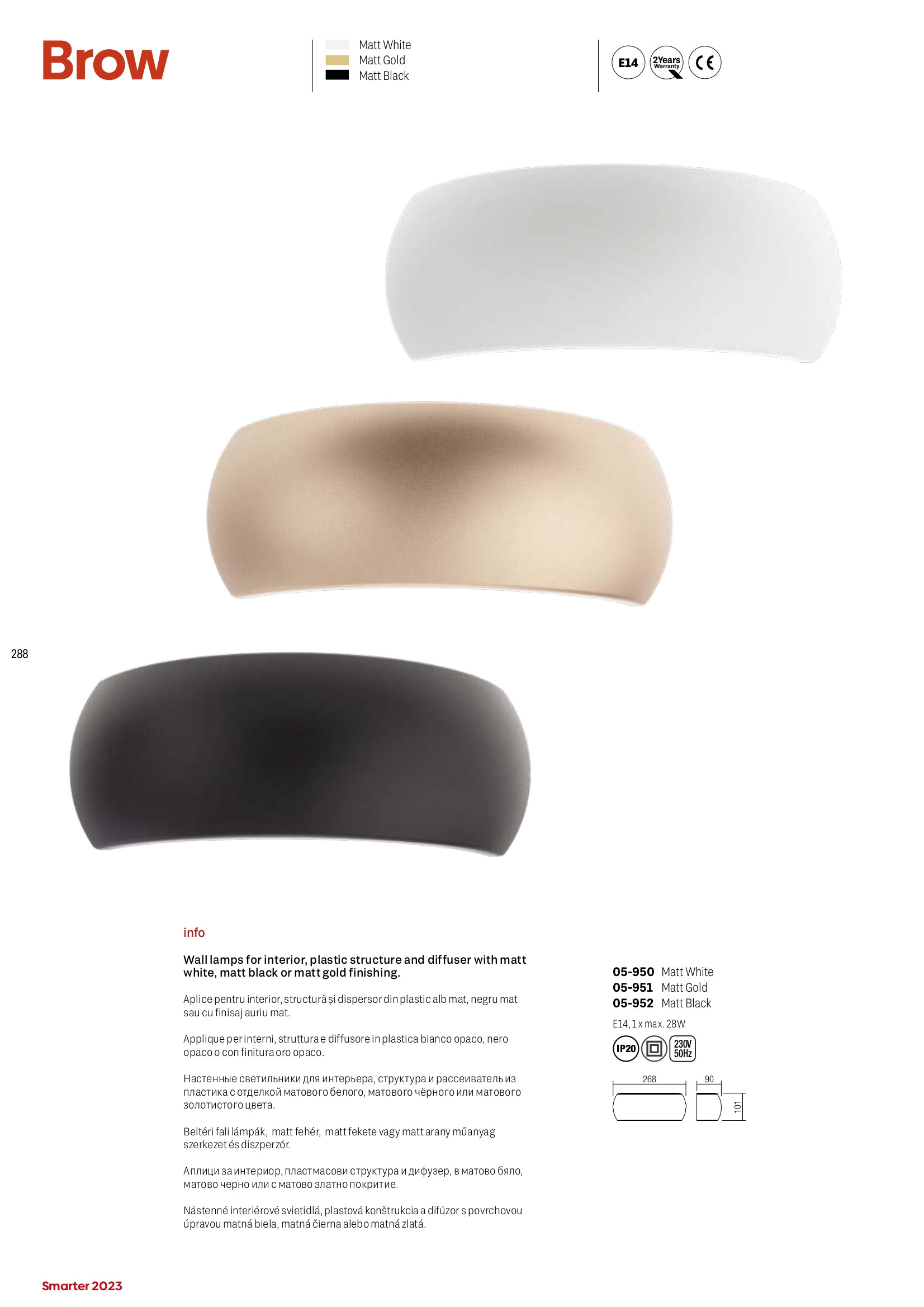 Осветителното тяло 05-950 ще осигури комфорт и естетика във всяко помещение, в което се постави. Цялостната визия и дизайн на лампата и вложените в изработката й материали, като полимер в матово бял цвят, дифузер в бяло, ще допринесат за един неповторим стил. Благодарение на дългогодишния опит, качествените материали и строгия контрол на качеството на изработка на дизайнерската линия Redo Smarter на производителя Redo (Румъния), 05-950 е на високо европейско ниво.
