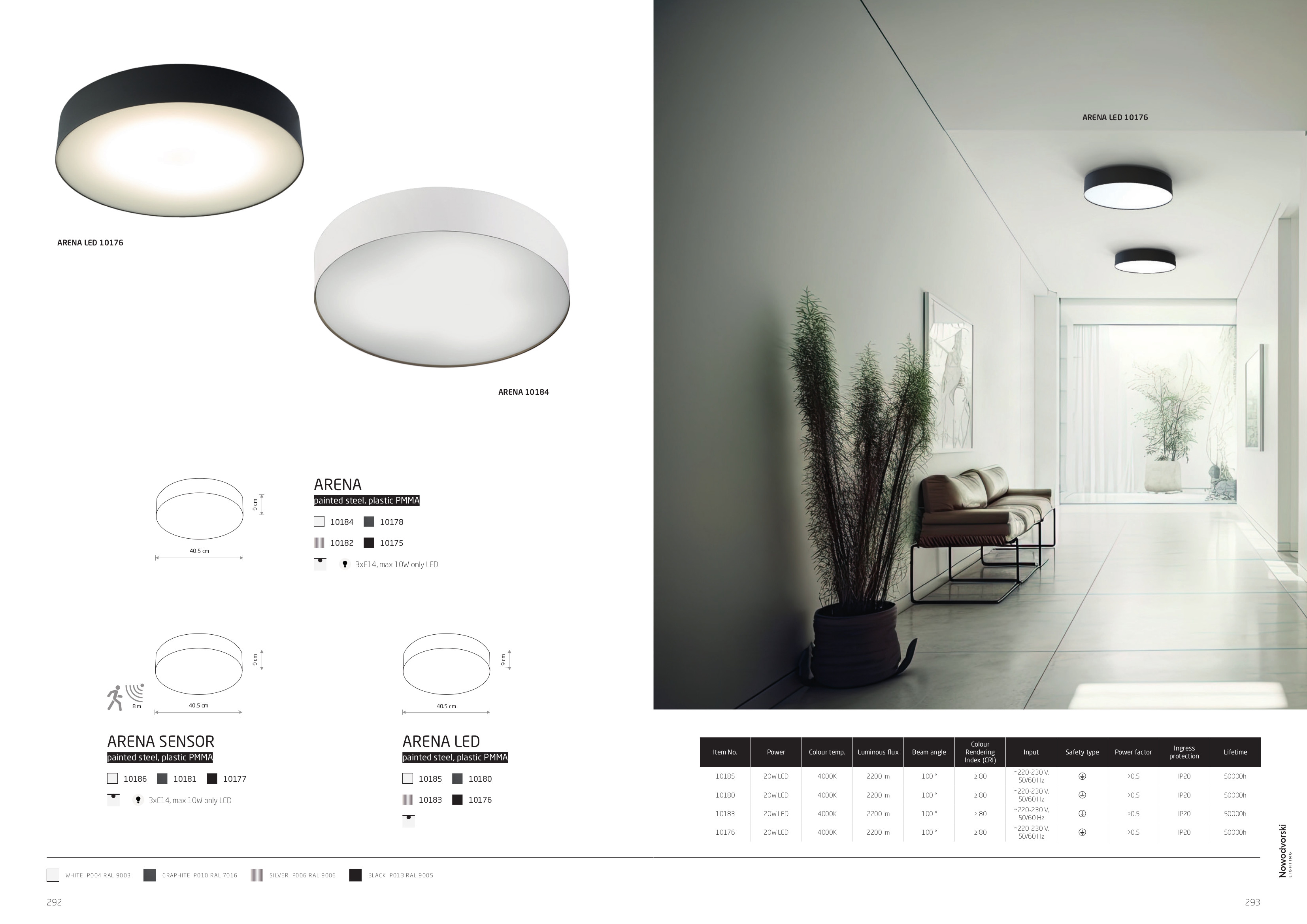 Осветителното тяло 10177 ARENA BLACK SENSOR ще осигури комфорт и естетика във всяко помещение, в което се постави. Цялостната визия и дизайн на лампата и вложените в изработката й материали, като стомана в черен цвят, полимер (РММА) в бяло, сензор за движение 8m, ще допринесат за един неповторим стил. Благодарение на дългогодишния опит, качествените материали и строгия контрол на качеството на изработка на производителя Nowodvorski (Полша), 10177 ARENA BLACK SENSOR е на високо европейско ниво.