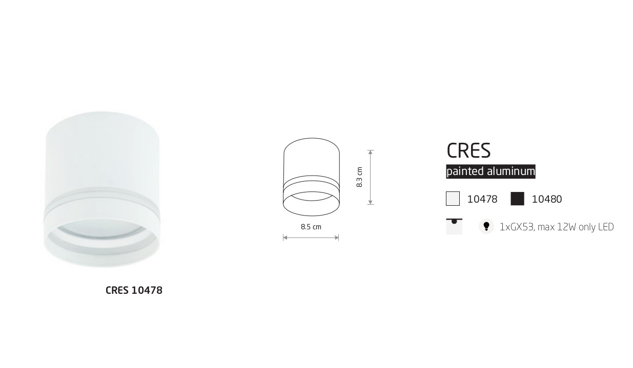Осветителното тяло 10478 CRES WH CG ще осигури комфорт и естетика във всяко помещение, в което се постави. Цялостната визия и дизайн на лампата и вложените в изработката й материали, като алуминий в бял цвят, ще допринесат за един неповторим стил. Благодарение на дългогодишния опит, качествените материали и строгия контрол на качеството на изработка на производителя Nowodvorski (Полша), 10478 CRES WH CG е на високо европейско ниво.