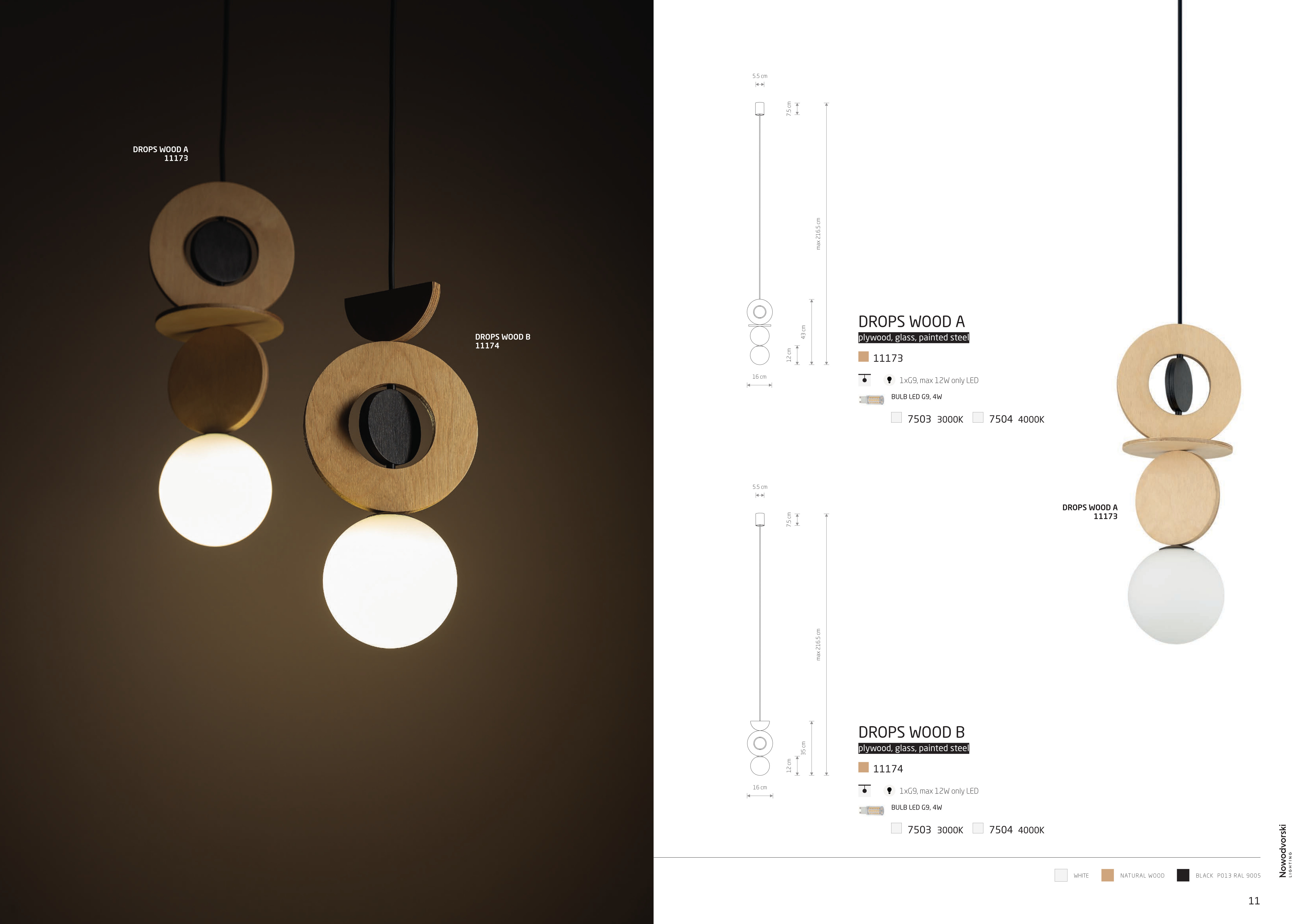 Осветителното тяло 11174 DROPS WOOD B ще осигури комфорт и естетика във всяко помещение, в което се постави. Цялостната визия и дизайн на лампата и вложените в изработката й материали, като шперплат в цвят светло и тъмно дърво, стомана в черен цвят, стъкло в бял цвят, ще допринесат за един неповторим стил. Благодарение на дългогодишния опит, качествените материали и строгия контрол на качеството на изработка на производителя Nowodvorski (Полша), 11174 DROPS WOOD B е на високо европейско ниво.