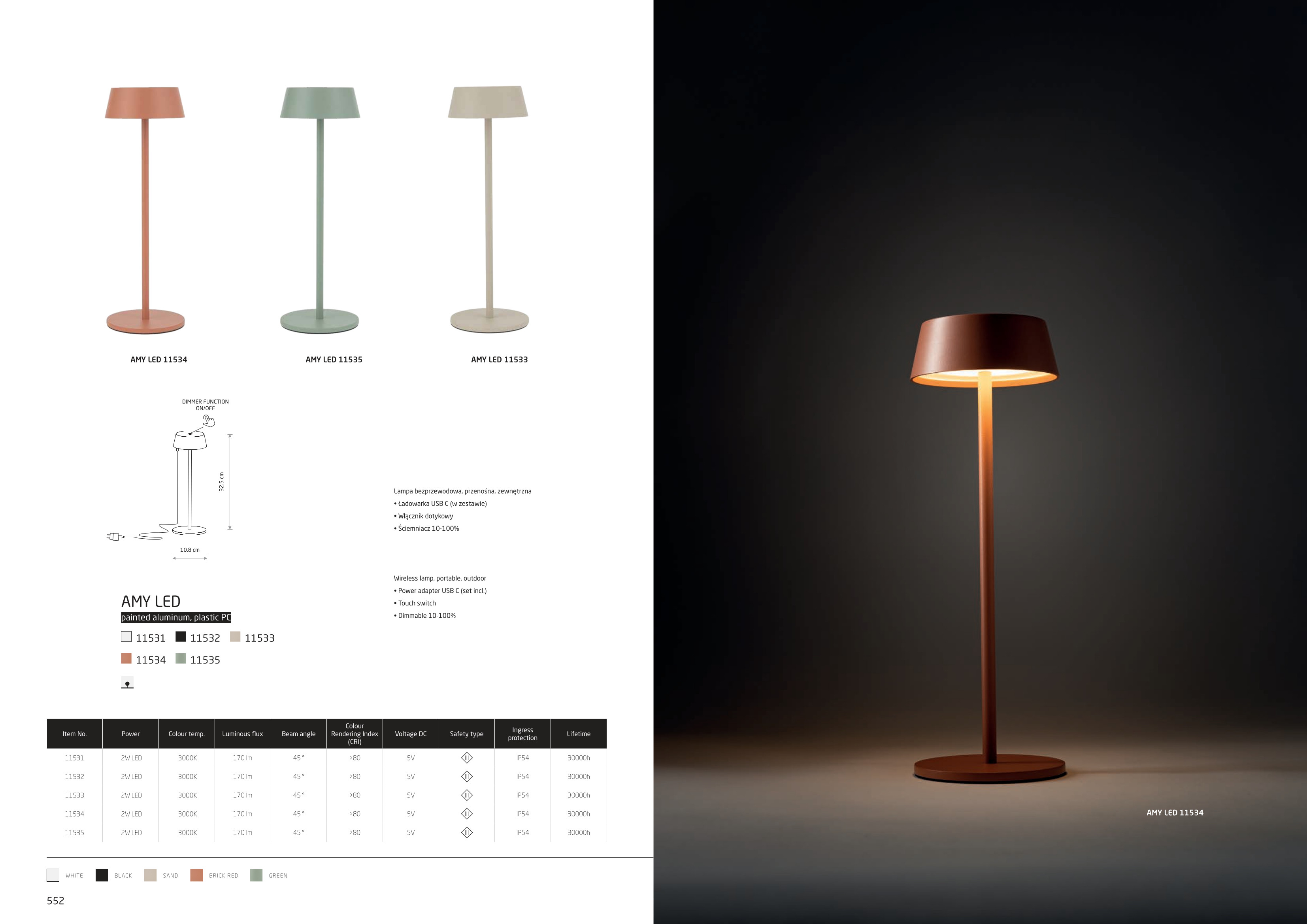 Осветителното тяло 11533 AMY LED SAND ще осигури комфорт и естетика във всяко помещение, в което се постави. Цялостната визия и дизайн на лампата и вложените в изработката й материали, като алуминий с покритие в пясъчен цвят, полимер, преносима лампа с USB тип С захранващ кабел, димиране чрез докосване от 10 до 100%, ще допринесат за един неповторим стил. Благодарение на дългогодишния опит, качествените материали и строгия контрол на качеството на изработка на производителя Nowodvorski (Полша), 11533 AMY LED SAND е на високо европейско ниво.
