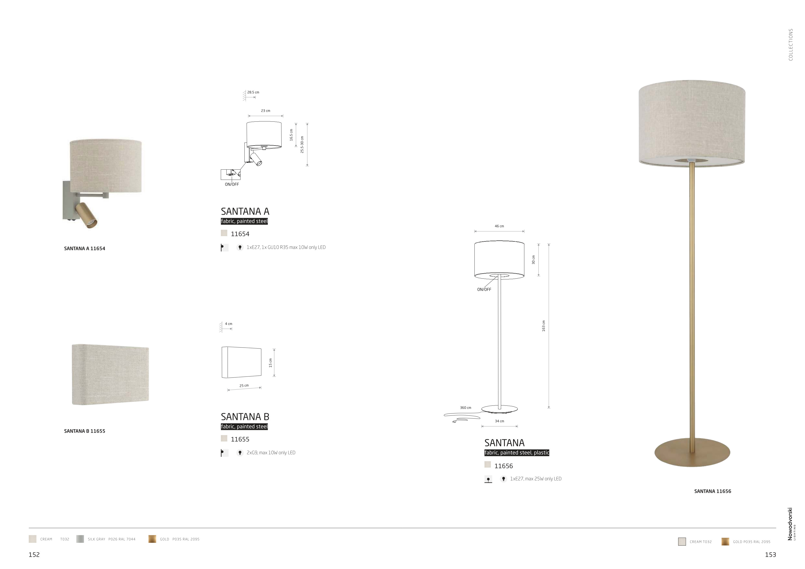 Осветителното тяло 11656 SANTANA FL ще осигури комфорт и естетика във всяко помещение, в което се постави. Цялостната визия и дизайн на лампата и вложените в изработката й материали, като текстил в цвят крем, стомана с покритие в цвят крем, полимер, превключвател ON/OFF, дължина на захранващия кабел 3.6m, ще допринесат за един неповторим стил. Благодарение на дългогодишния опит, качествените материали и строгия контрол на качеството на изработка на производителя Nowodvorski (Полша), 11656 SANTANA FL е на високо европейско ниво.