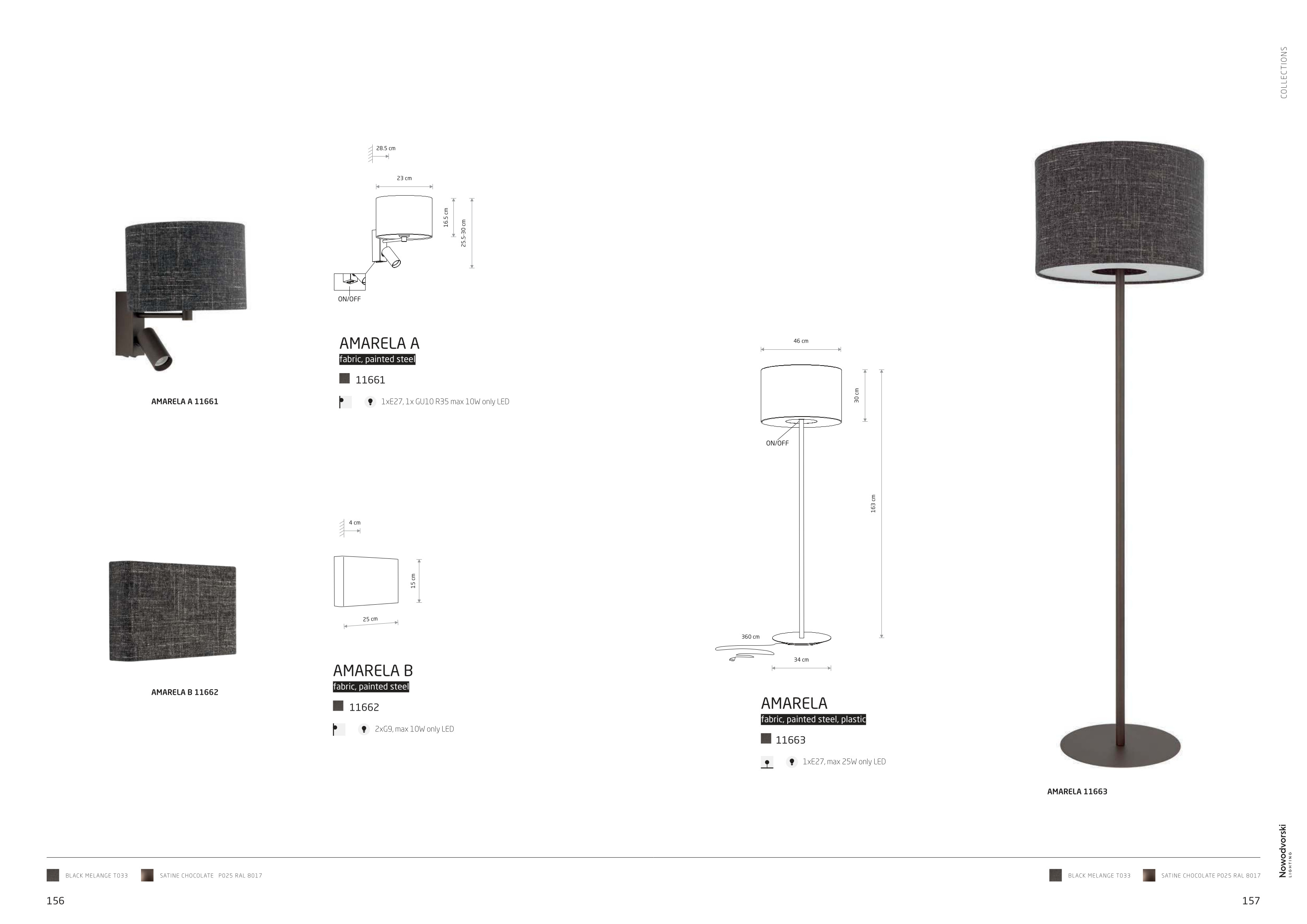 Осветителното тяло 11663 AMARELA FL ще осигури комфорт и естетика във всяко помещение, в което се постави. Цялостната визия и дизайн на лампата и вложените в изработката й материали, като текстил в цвят черен меланж, стомана в цвят сатениран шоколад, полимер, превключвател ON/OFF, дължина на захранващия кабел 3.6m, ще допринесат за един неповторим стил. Благодарение на дългогодишния опит, качествените материали и строгия контрол на качеството на изработка на производителя Nowodvorski (Полша), 11663 AMARELA FL е на високо европейско ниво.