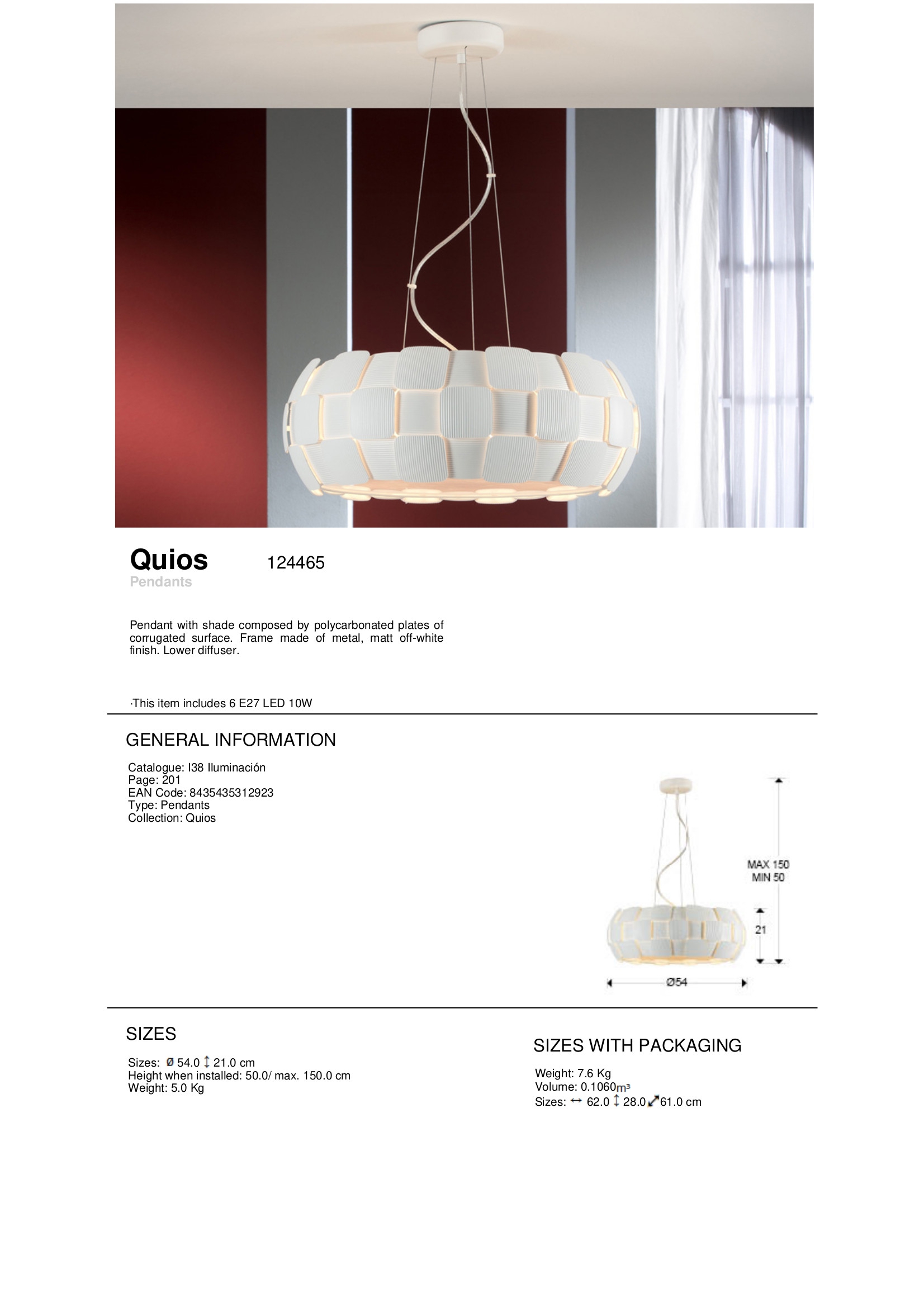 Лед полилей 124465 QUIOS PENDANT, 6L. ще осигури комфорт и естетика във всяко помещение, в което се постави. Цялостната визия и дизайн на led лампата и вложените в изработката й материали, като плочи от поликарбонат в бял цвят с гофрирана повърхност, метална основа, долен бял дифузьор от полимер , ще допринесат за един неповторим стил. Благодарение на дългогодишния опит в производството на лед осветление, качествените материали и строгия контрол на качеството на изработка на производителя Schuller (Испания), 124465 QUIOS PENDANT, 6L. е на високо европейско ниво.