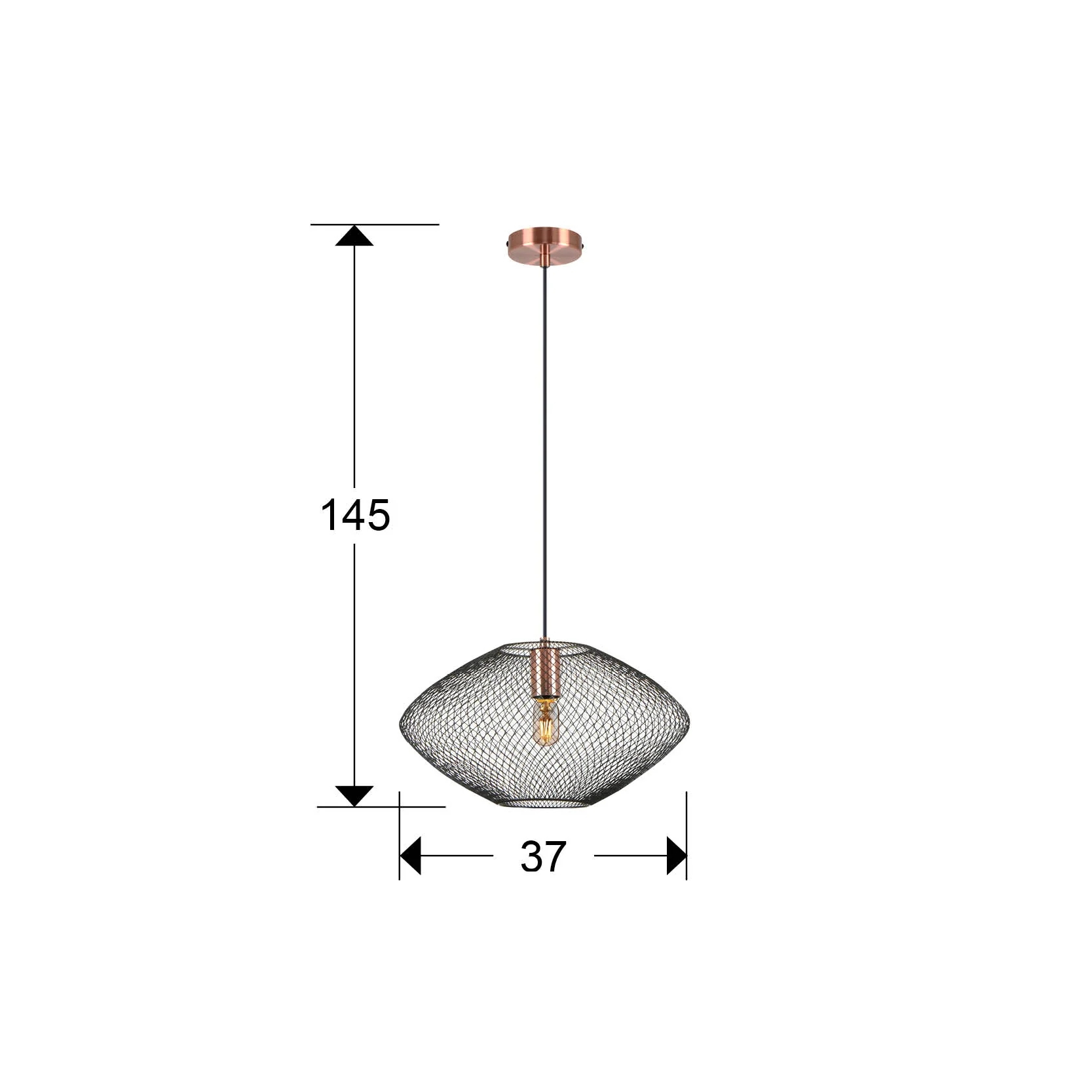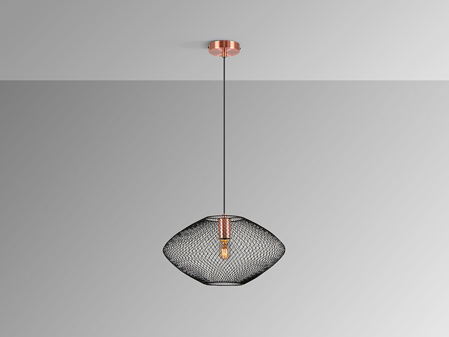 Стилът и естетиката на обстановката ще се обогатят благодарение, както на цялостната визия и дизайн на осветителното тяло, така и на вложените в изработката му, качествени материали, като: метал с покритие от сатенирана мед, метална мрежа в матово черно.
