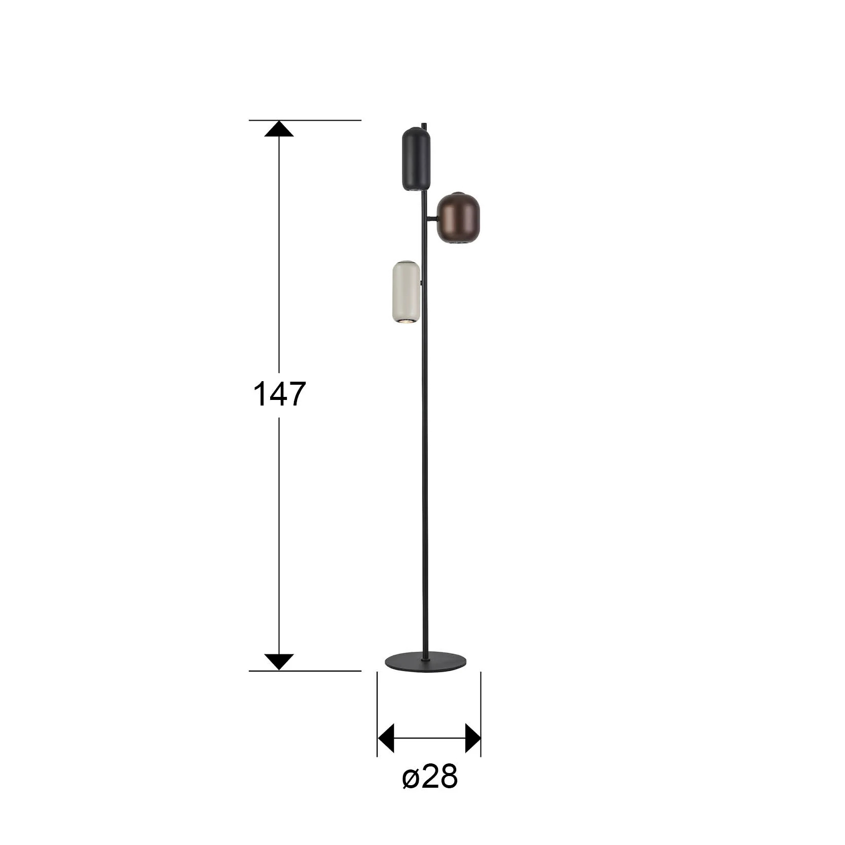 метал в матово черен цвят, 3 метални абажура: в матово черно, тъмнокафяво и светло сиво