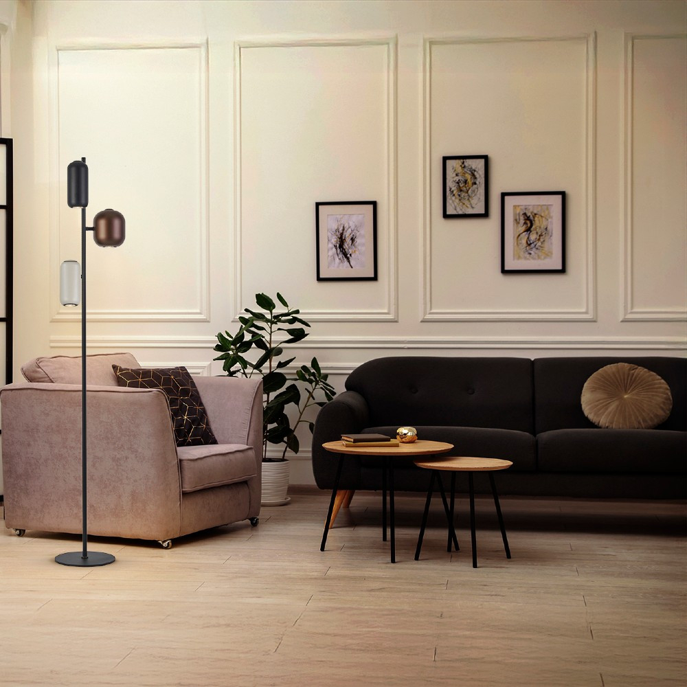 За стила и естетиката на обстановката в изключително висока степен допринасят, както цялостната визия, стилна изработка и елегантен дизайн на осветителното тяло, така също и използваните при изработката материали, като: метал в матово черен цвят, 3 метални абажура: в матово черно, тъмнокафяво и светло сиво.