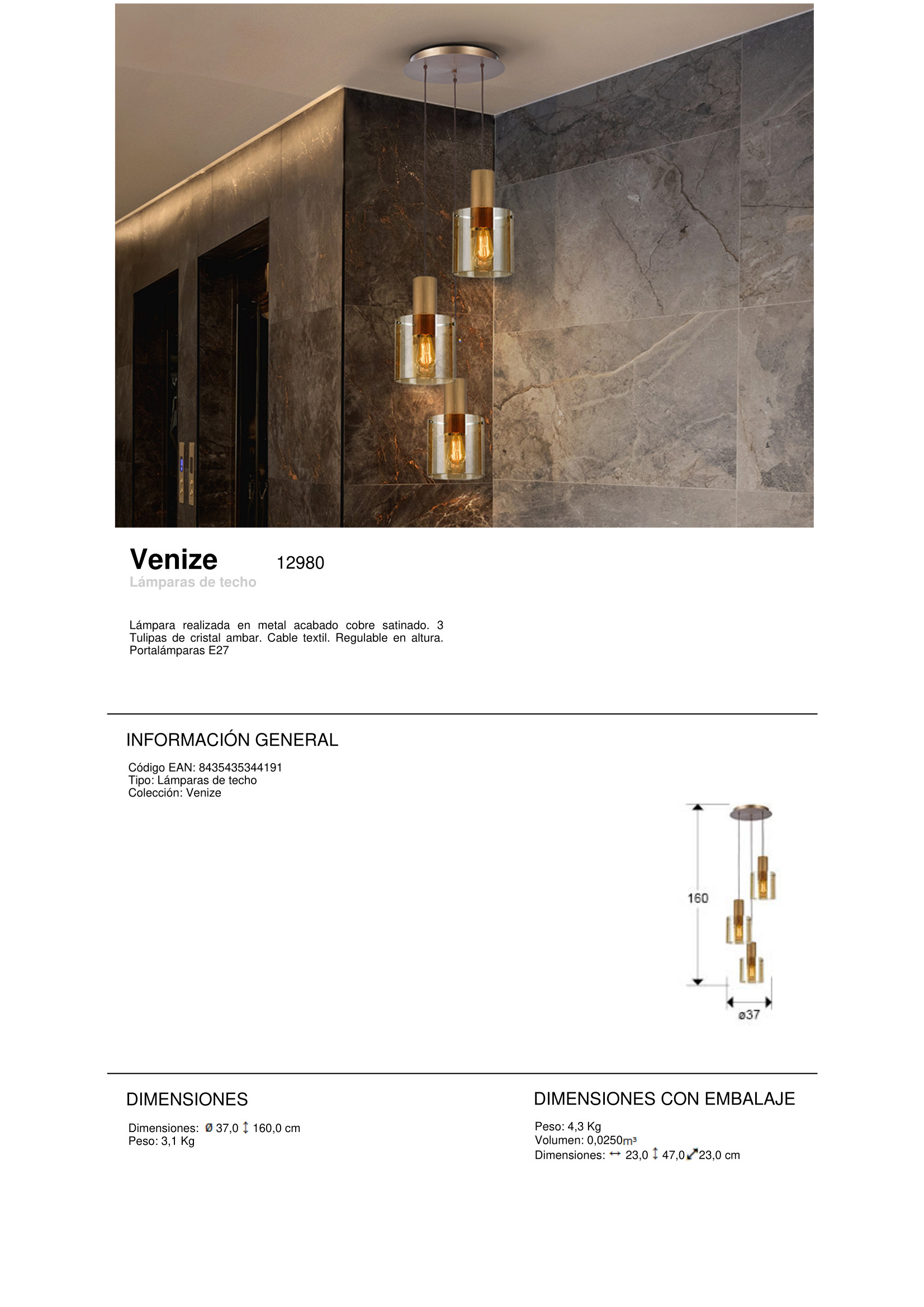 Магазини ОРИОН представят осветителното тяло 12980 I3 - VENIZE - LAMP 3L COPPER-AMBER, което представлява полилей в съвременен стил. Лампата е част от категорията полилеи и е подходяща за различни помещения и пространства, като например всекидневна / хол, спалня, кухня, трапезария, коридор, антре, офис.