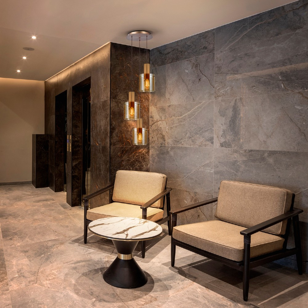 За стила и естетиката на интериора допринасят, както цялостната визия и дизайн на осветителното тяло, така и вложените от производителя в изработката висококачествени материали, като метал в цвят сатенирана мед, стъкло в цвят кехлибар, кабел с черна текстилна оплетка.