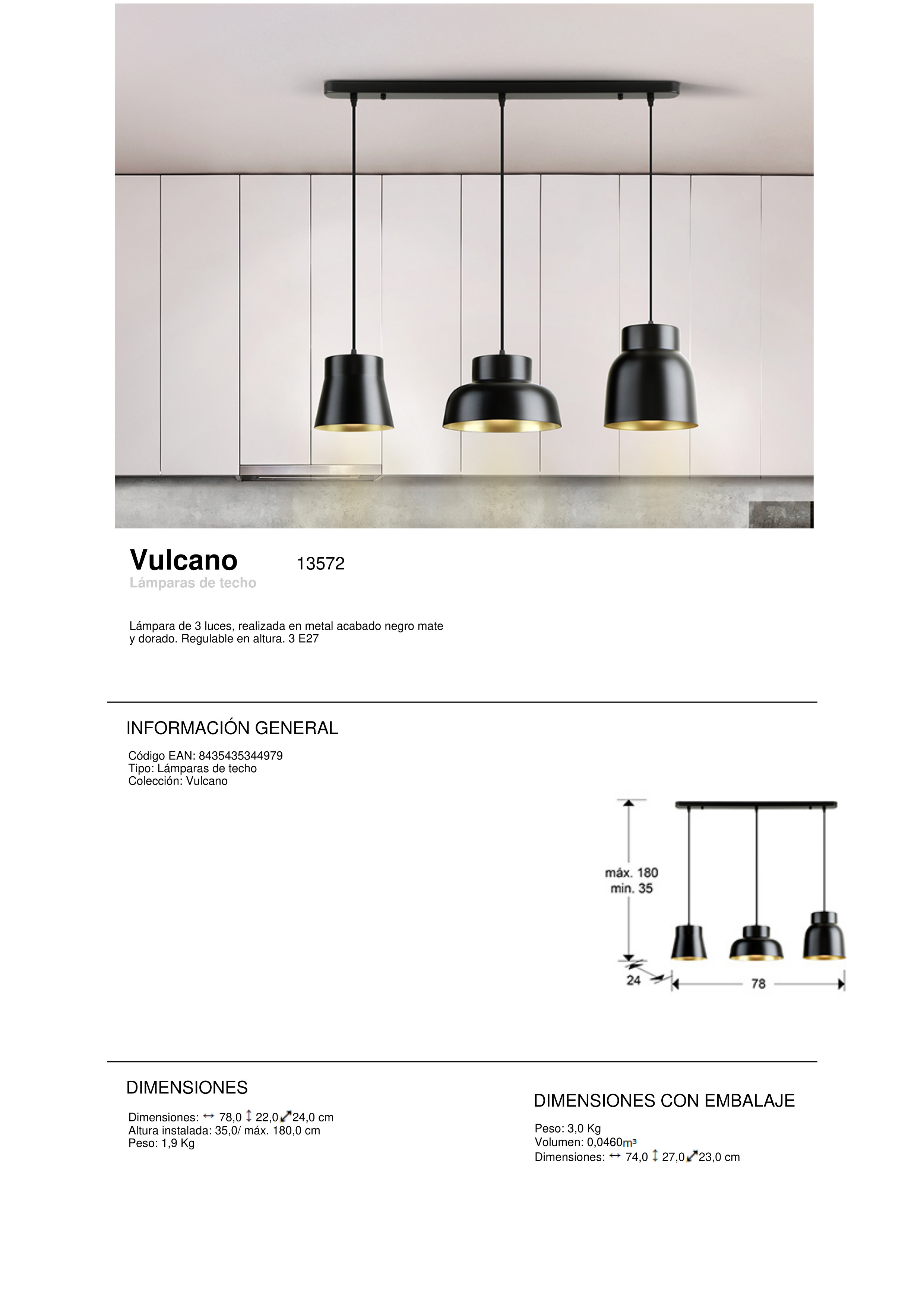 Магазини ОРИОН представят осветителното тяло 13572 I3 - VULCANO - LAMP 3L - BLACK/GOLDEN, което представлява полилей в съвременен стил. Лампата е част от категорията полилеи и е подходяща за различни помещения и пространства, като например всекидневна / хол, спалня, кухня, трапезария, офис.