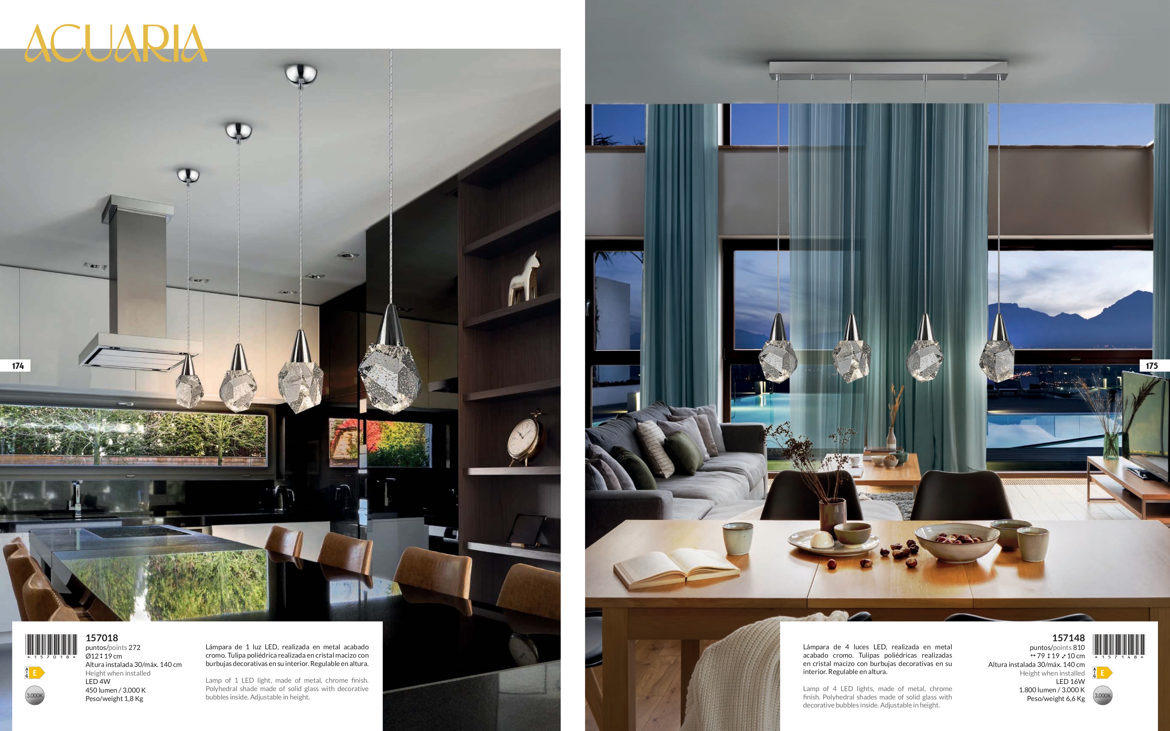 Осветителното тяло 157148 AQUARIA LAMP 4L, CHROME ще осигури комфорт и естетика във всяко помещение, в което се постави. Цялостната визия и дизайн на лампата и вложените в изработката й материали, като метал с матово хромирано покритие, многостенни абажури от масивно стъкло с декоративни балончета вътре, регулируема на височина, ще допринесат за един неповторим стил. Благодарение на дългогодишния опит, качествените материали и строгия контрол на качеството на изработка на производителя Schuller (Испания), 157148 AQUARIA LAMP 4L, CHROME е на високо европейско ниво.